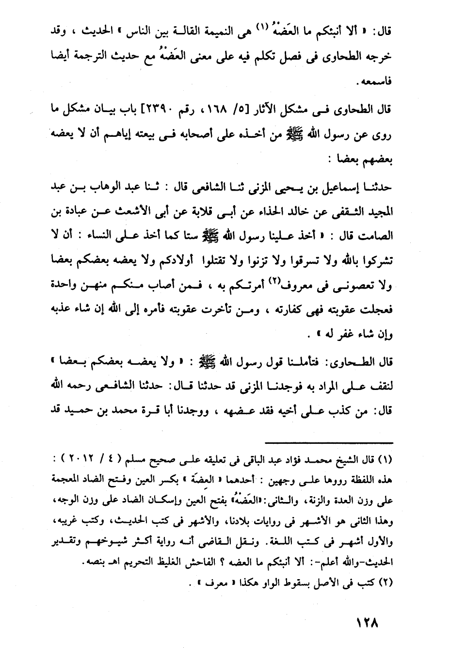 قال الطحاوى في مشكل الآثار [5/ 168، رقم 2390] باب بيان مشكل ما روى عن رسول اللَّه -صلى اللَّه عليه وسلم- من أخذه على أصحابه في بيعته إياهم أن لا يعضه بعضهم بعضا:
