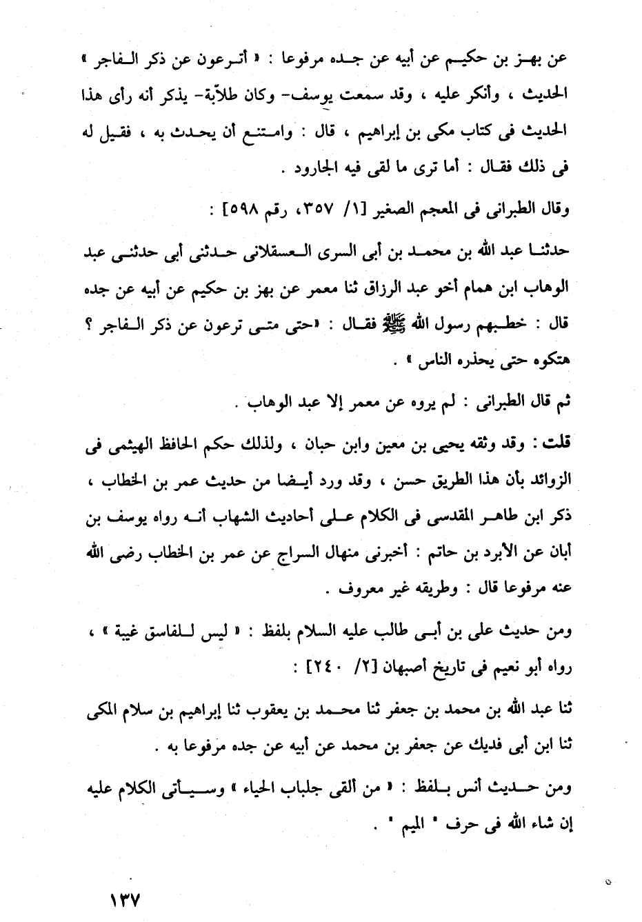 حدثنا عبد اللَّه بن محمد بن أبي السرى العسقلانى حدثنى أبي حدثنى عبد الوهاب ابن همام أخو عبد الرزاق ثنا معمر عن بهز بن حكيم عن أبيه عن جده قال: خطبهم رسول اللَّه -صلى اللَّه عليه وسلم- فقال: "حتى متى ترعون عن ذكر الفاجر؟ هتكوه حتى يحذره الناس".
