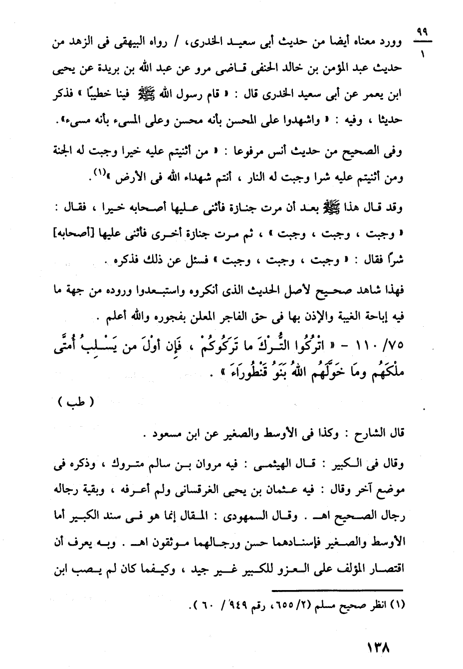 وورد معناه أيضا من حديث أبي سعيد الخدرى، رواه البيهقى في الزهد من حديث عبد المؤمن بن خالد الحنفى قاضى مرو عن عبد اللَّه بن بريدة عن يحيى ابن يعمر عن أبي سعيد الخدرى قال: "قام رسول اللَّه -صلى اللَّه عليه وسلم- فينا خطيبًا" فذكر حديثا، وفيه: "واشهدوا على المحسن بأنه محسن وعلى المسئ بأنه مسئ". وفي الصحيح من حديث أنس مرفوعا: "من أثنيتم عليه خيرا وجبت له الجنة ومن أثنيتم عليه شرا وجبت له النار، أنتم شهداء اللَّه في الأرض" (¬1).