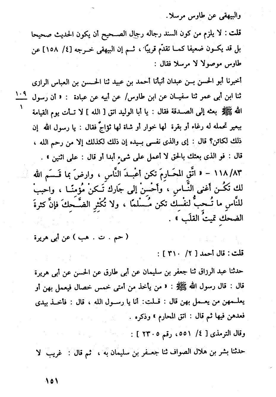 83/ 118 - "اتَّق المحَارِمَ تكن أعْبدَ النَّاسِ، وارضَ بما قَسَم اللَّه لك تَكُن أغنى النَّاسِ، وأحْسِنْ إلى جَارك تَكنْ مُؤمِنًا، واحببْ للنَّاسِ ما تُحِبُّ لنفْسك تكن مُسْلمًا، ولا تُكْثِرِ الضَّحِكَ فإنَّ كثرةَ الضحكِ تميتُ القلَبَ".