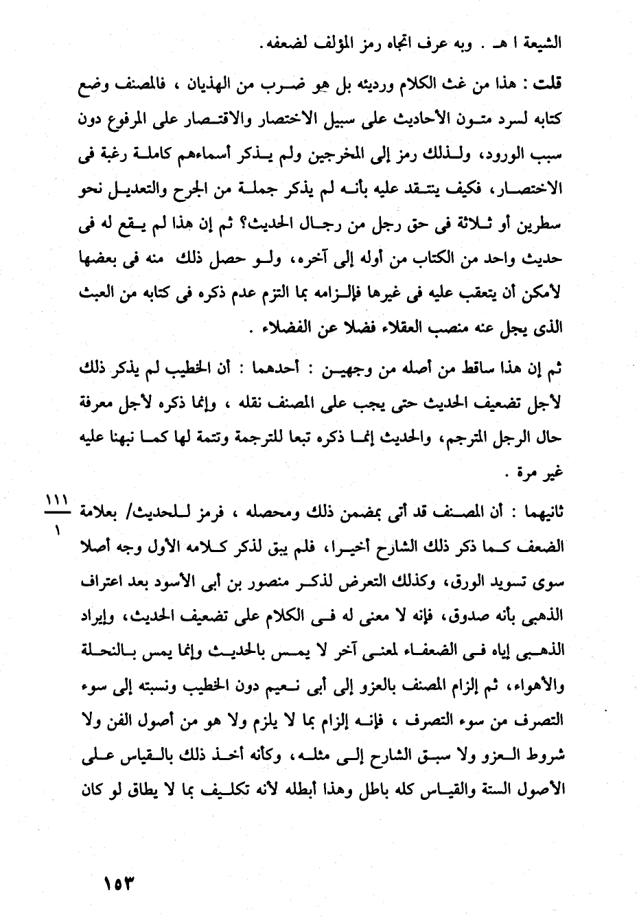 ثانيهما: أن المصنف قد أتى بمضمن ذلك ومحصله، فرمز للحديث بعلامة الضعف كما ذكر ذلك الشارح أخيرا، فلم يبق لذكر كلامه الأول وجه أصلا سوى تسويد الورق، وكذلك التعرض لذكر منصور بن أبي الأسود بعد اعتراف الذهبى بأنه صدوق، فإنه لا معنى له في الكلام على تضعيف الحديث، وإيراد الذهبى إياه في الضعفاء لمعنى آخر لا يمس بالحديث وإنما يمس بالنحلة والأهواء، ثم إلزام المصنف بالعزو إلى أبي نعيم دون الخطيب ونسبته إلى سوء التصرف من سوء التصرف، فإنه إلزام بما لا يلزم ولا هو من أصول الفن ولا شروط العزو ولا سبق الشارح إلى مثله، وكأنه أخذ ذلك بالقياس على الأصول الستة والقياس كله باطل وهذا أبطله لأنه تكليف بما لا يطاق لو كان
