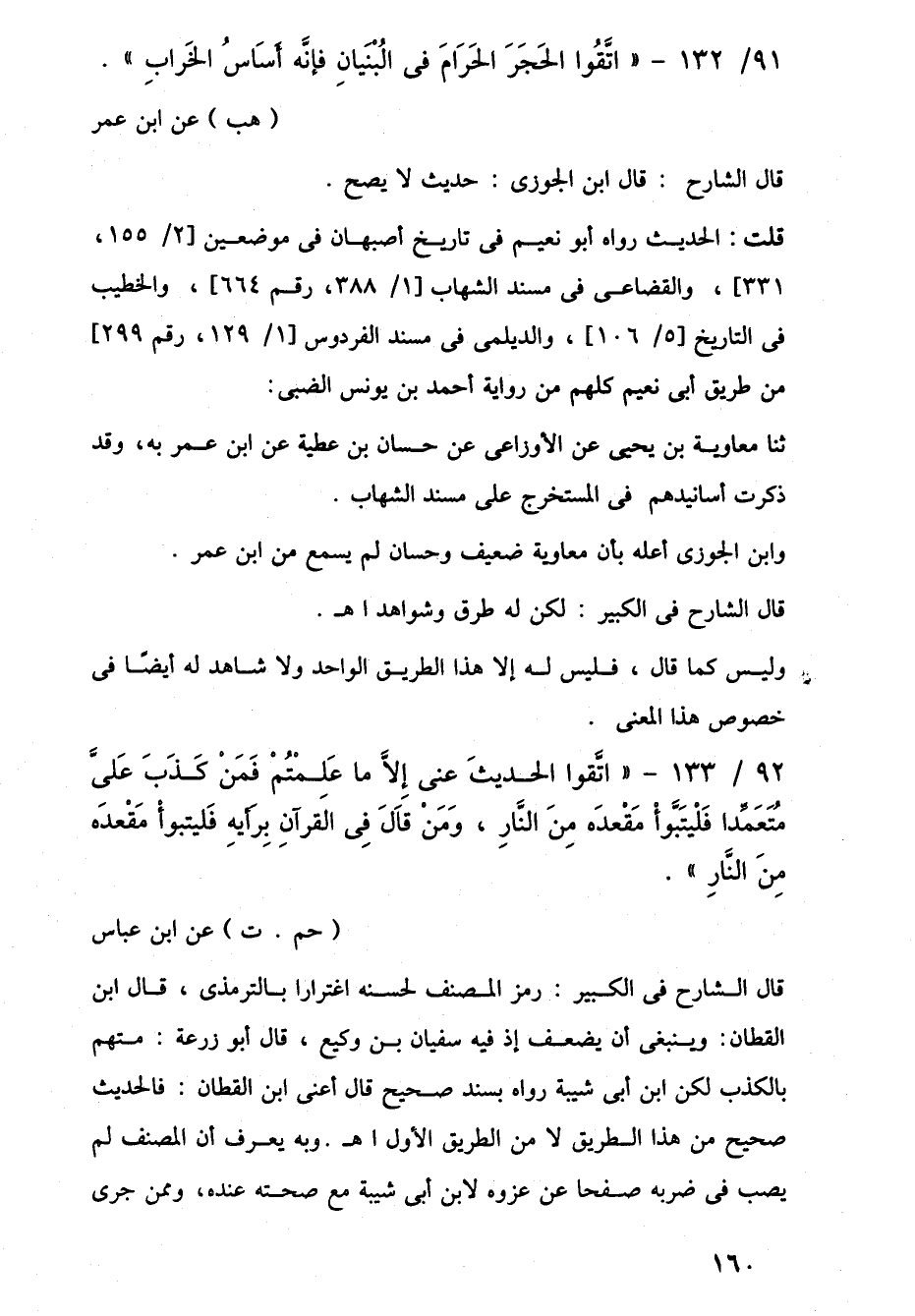 92/ 133 - "اتَّقوا الحديثَ عنى إِلَّا ما عَلمْتُمْ فَمَنْ كَذَبَ عَلىَّ مُتَعَمِّدا فَلْيتَبَّوأْ مَقْعدَه مِنَ النَّارِ، وَمَنْ قاَلَ فِى القرآنِ بِرَأيِه فَليتبوأْ مَقْعدَه مِنَ النَّارِ". (حم. ت) عن ابن عباس