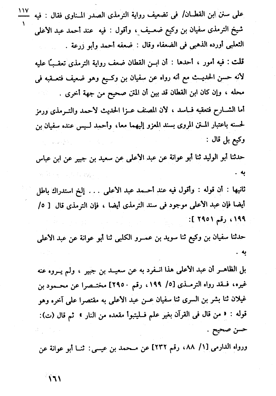 على سنن ابن القطان في تضعيف رواية الترمذى الصدر المناوى فقال: فيه شيخ الترمذى سفيان بن وكيع ضعيف، وأقول: فيه عند أحمد عبد الأعلى الثعلبى أورده الذهبى في الضعفاء وقال: ضعفه أحمد وأبو زرعة.