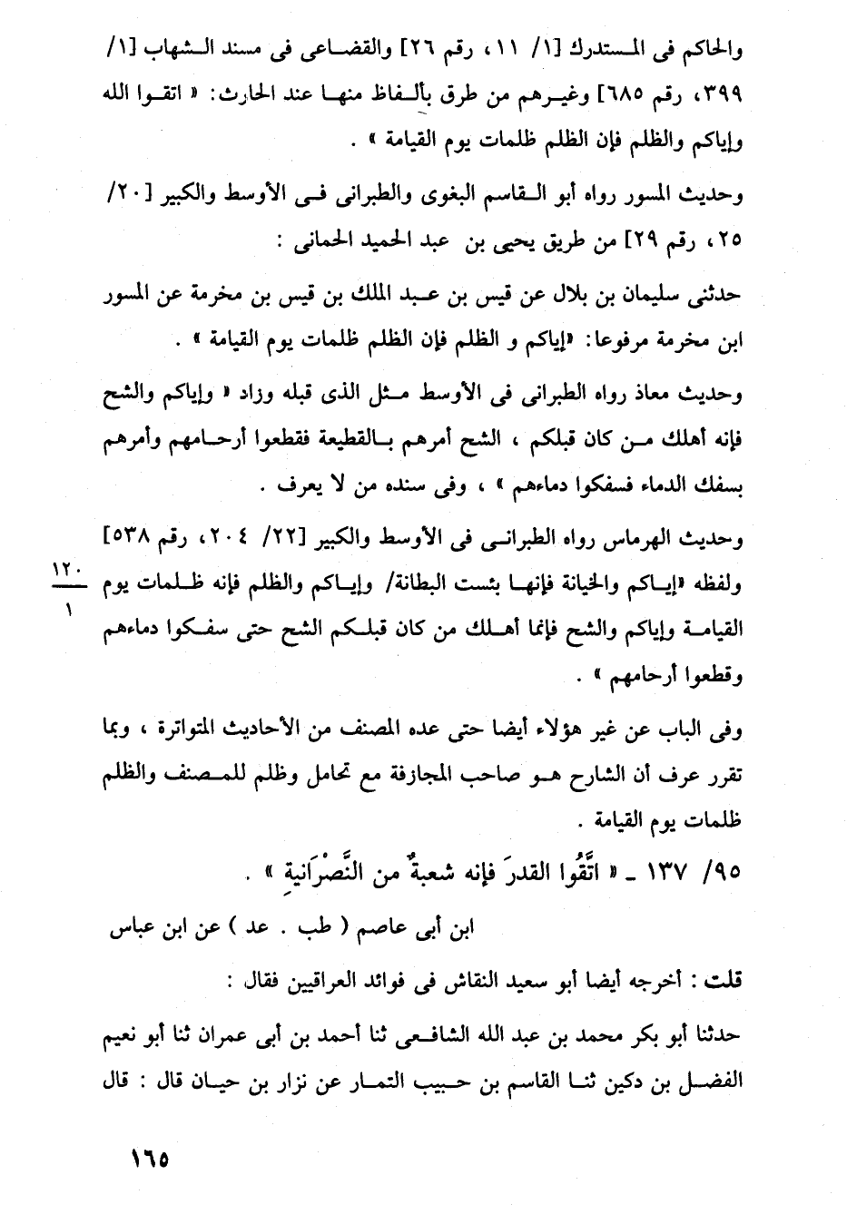 حدثنى سليمان بن بلال عن قيس بن عبد الملك بن قيس بن مخرمة عن المسور ابن مخرمة مرفوعا: "إياكم والظلم فإن الظلم ظلمات يوم القيامة". وحديث معاذ رواه الطبرانى في الأوسط مثل الذي قبله وزاد "وإياكم والشح فإنه أهلك من كان قبلكم، الشح أمرهم بالقطيعة فقطعوا أرحامهم وأمرهم بسفك الدماء فسفكوا دماءهم"، وفي سنده من لا يعرف.