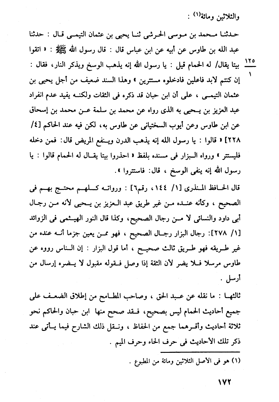 حدثنا محمد بن موسى الحرشى ثنا يحيى بن عثمان التيمى قال: حدثنا عبد اللَّه بن طاوس عن أبيه عن ابن عباس قال: قال رسول اللَّه -صلى اللَّه عليه وسلم-: "اتقوا بيتا يقال له الحمام قيل: يا رسول اللَّه إنه يذهب الوسخ ويذكر النار، فقال: إن كنتم لا بد فاعلين فادخلوه مستترين" وهذا السند ضعيف من أجل يحيى بن عثمان التيمى، على أن ابن حبان قد ذكره في الثقات ولكنه يفيد عدم انفراد عبد العزيز بن يحيى به الذي رواه عن محمد بن سلمة عن محمد بن إسحاق عن ابن طاوس وعن أيوب السختيانى عن طاوس به، لكن فيه عند الحاكم [4/ 228] "قالوا: يا رسول اللَّه إنه يذهب الدرن وينفع المريض قال: فمن دخله فليستتر" ورواه البزار في مسنده بلفظ "احذروا بيتا يقال له الحمام قالوا: يا رسول اللَّه إنه ينفى الوسخ، قال: فاستتروا".