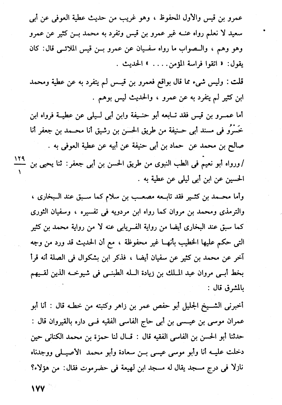 عمرو بن قيس والأول المحفوظ، وهو غريب من حديث عطية العوفى عن أبي سعيد لا نعلم رواه عنه غير عمرو بن قيس وتفرد به محمد بن كثير عن عمرو وهو وهم، والصواب ما رواه سفيان عن عمرو بن قيس الملائى قال: كان يقول: "اتقوا فراسة المؤمن. . . " الحديث.
