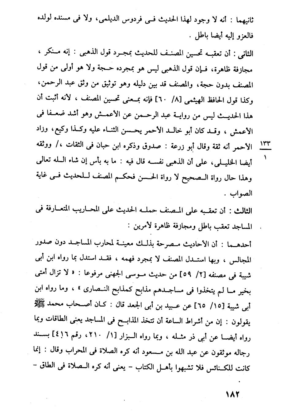 الثانى: أن تعقبه تحسين المصنف للحديث بمجرد قول الذهبى: إنه منكر، مجازفة ظاهرة، فإن قول الذهبى ليس هو بمجرده حجة ولا هو أولى من قول المصنف بدون حجة، والمصنف قد بين دليله وهو توثيق من وثق عبد الرحمن، وكذا قول الحافظ الهيثمى [8/ 60] فإنه بمعنى تحسين المصنف، لأنه أثبت أن هذا الحديث ليس من رواية عبد الرحمن عن الأعمش وهو أشد ضعفا في الأعمش، وقد كان أبو خالد الأحمر يحسن الثناء عليه وكذا وكيع، وزاد الأحمر أنه ثقة وقال أبو زرعة: صدوق وذكره ابن حبان في الثقات، ووثقه أيضا الخليلى، على أن الذهبى نفسه قال فيه: ما به بأس إن شاء اللَّه تعالى وهذا حال رواة الصحيح لا رواة الحسن فحكم المصنف للحديث في غاية الصواب.