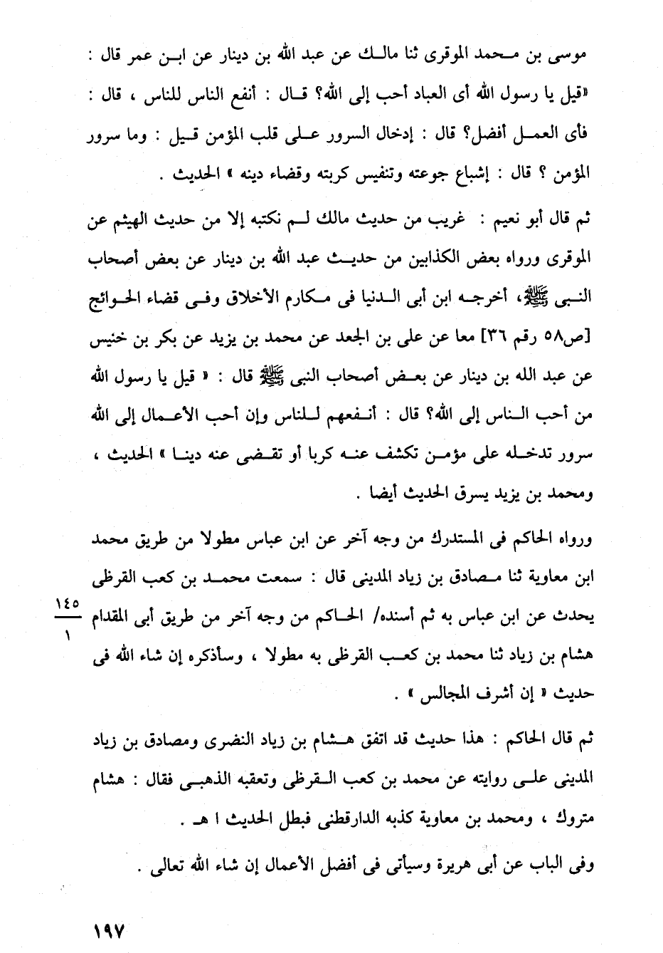موسى بن محمد الموقرى ثنا مالك عن عبد اللَّه بن دينار عن ابن عمر قال: "قيل يا رسول اللَّه أى العباد أحب إلى اللَّه؟ قال: أنفع الناس للناس، قال: فأى العمل أفضل؟ قال: إدخال السرور على قلب المؤمن قيل: وما سرور المؤمن؟ قال: إشباع جوعته وتنفيس كربته وقضاء دينه" الحديث.