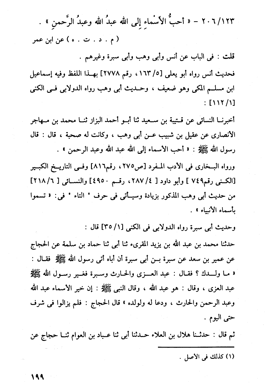 123/ 206 - "أحبُّ الأَسْماءِ إِلى اللَّه عبدُ اللَّه وعبدُ الرَّحمنِ". (م. د. ت. هـ) عن ابن عمر