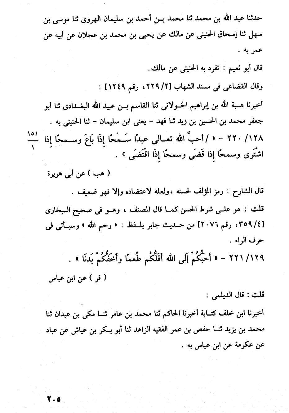 128/ 220 - "أحبَّ اللَّه تعالى عبدًا سَمْحًا إِذَا بَاعَ وسمحًا إِذا اشتَرى وسمحًا إِذا قَضَى وسمحًا إِذَا اقْتَضَى". (هب) عن أبي هريرة