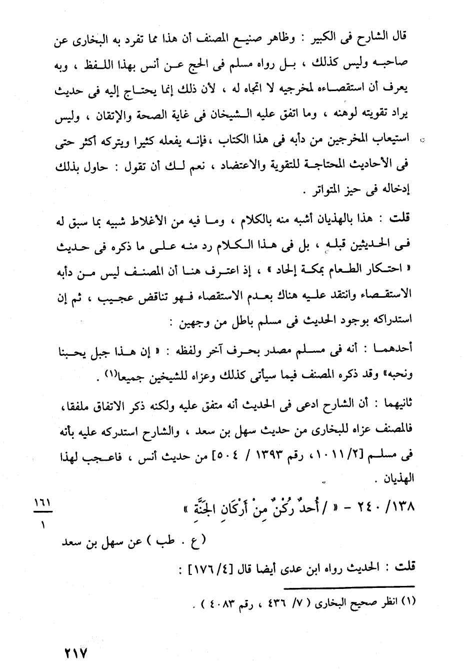 قلت: هذا بالهذيان أشبه منه بالكلام، وما فيه من الأغلاط شبيه بما سبق له في الحديثين قبله، بل في هذا الكلام رد منه على ما ذكره في حديث "احتكار الطعام بمكة إلحاد"، إذ اعترف هنا أن المصنف ليس من دأبه الاستقصاء وانتقد عليه هناك بعدم الاستقصاء فهو تناقض عجيب، ثم إن استدراكه بوجود الحديث في مسلم باطل من وجهين:
