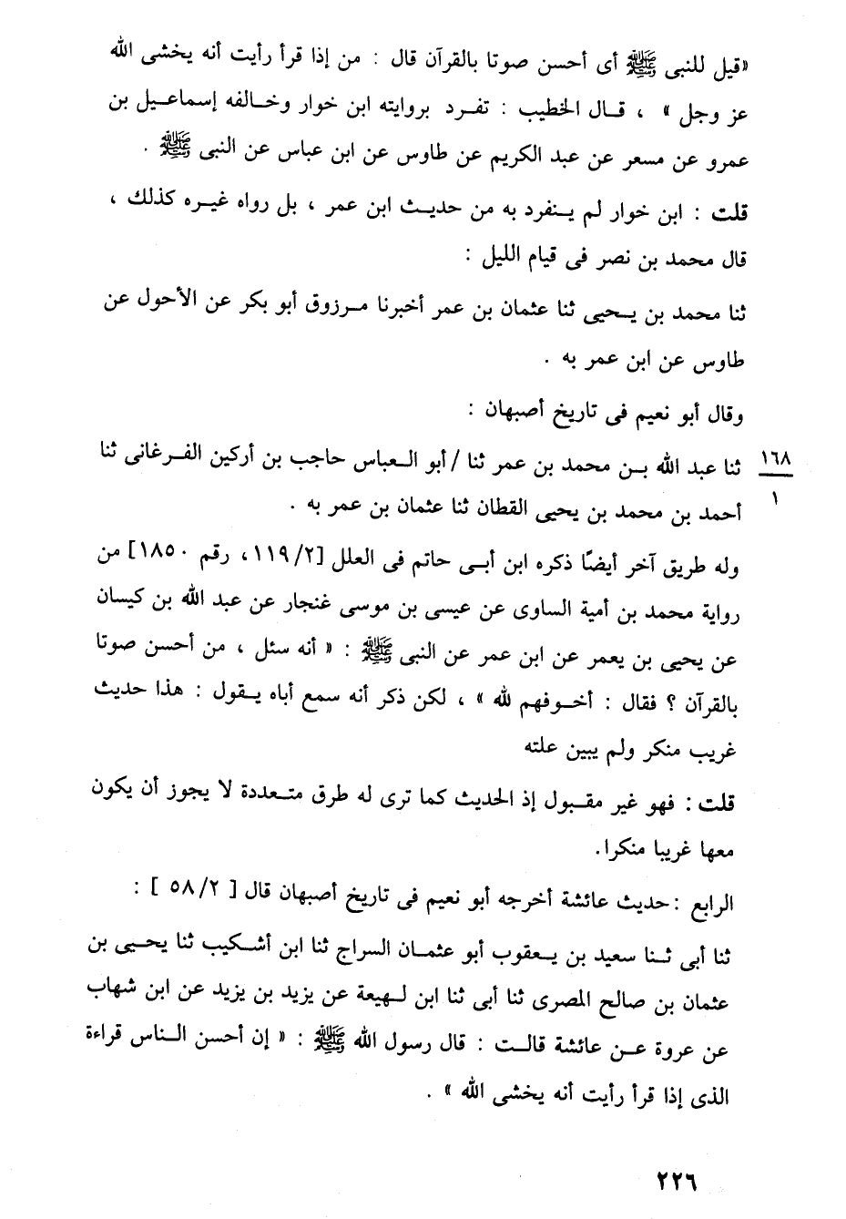 "قيل للنبي -صلى اللَّه عليه وسلم- أى أحسن صوتا بالقرآن قال: من إذا قرأ رأيت أنه يخشى اللَّه عز وجل"، قال الخطيب: تفرد بروايته ابن خوار وخالفه إسماعيل بن عمرو عن مسعر عن عبد الكريم عن طاوس عن ابن عباس عن النبي -صلى اللَّه عليه وسلم-.