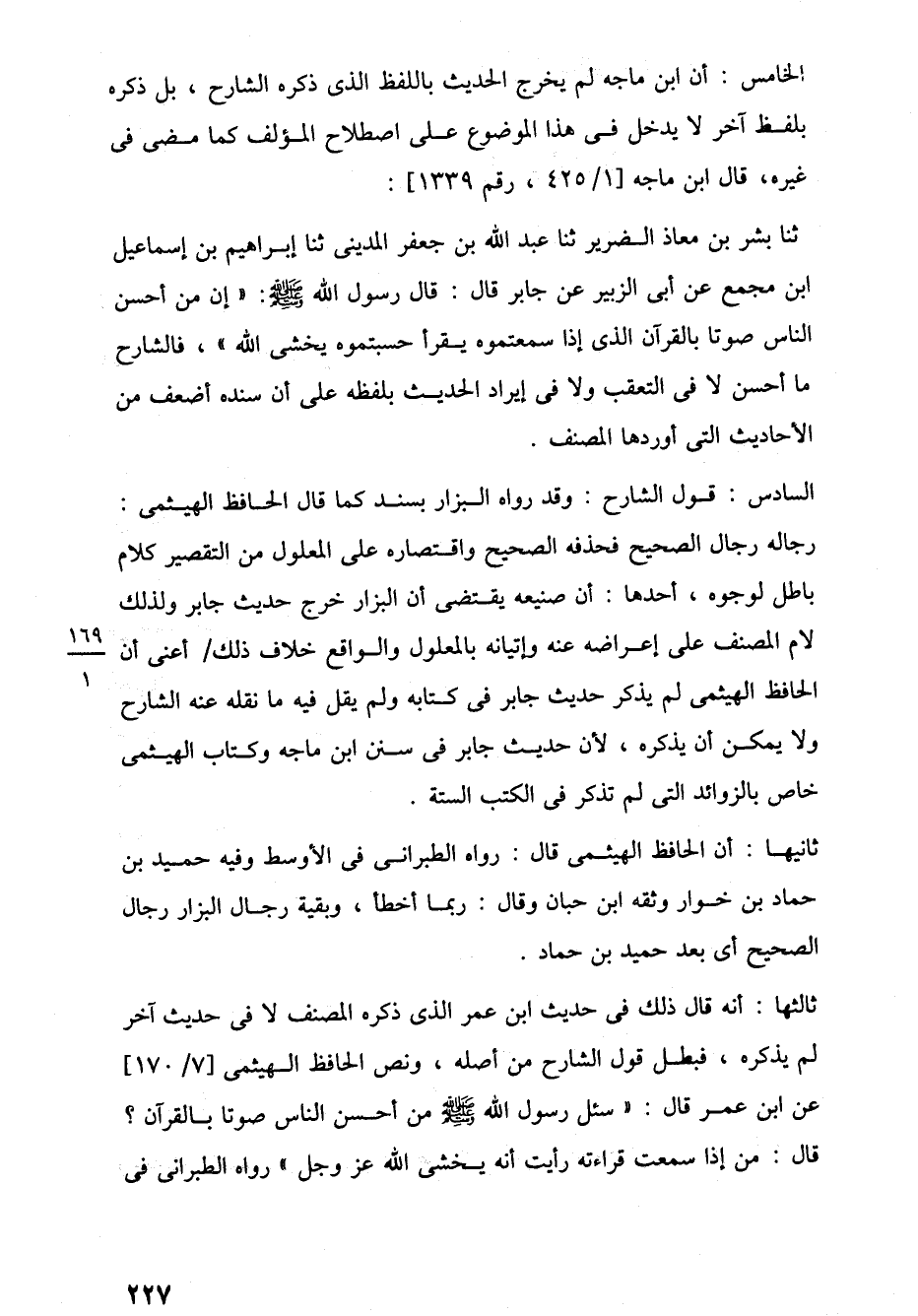السادس: قول الشارح: وقد رواه البزار بسند كما قال الحافظ الهيثمى: رجاله رجال الصحيح فحذفه الصحيح واقتصاره على المعلول من التقصير كلام باطل لوجوه، أحدها: أن صنيعه يقتضى أن البزار خرج حديث جابر ولذلك لام المصنف على إعراضه عنه وإتيانه بالمعلول والواقع خلاف ذلك أعنى أن الحافظ الهيثمى لم يذكر حديث جابر في كتابه ولم يقل فيه ما نقله عنه الشارح ولا يمكن أن يذكره، لأن حديث جابر في سنن ابن ماجه وكتاب الهيثمى خاص بالزوائد التي لم تذكر في الكتب الستة.