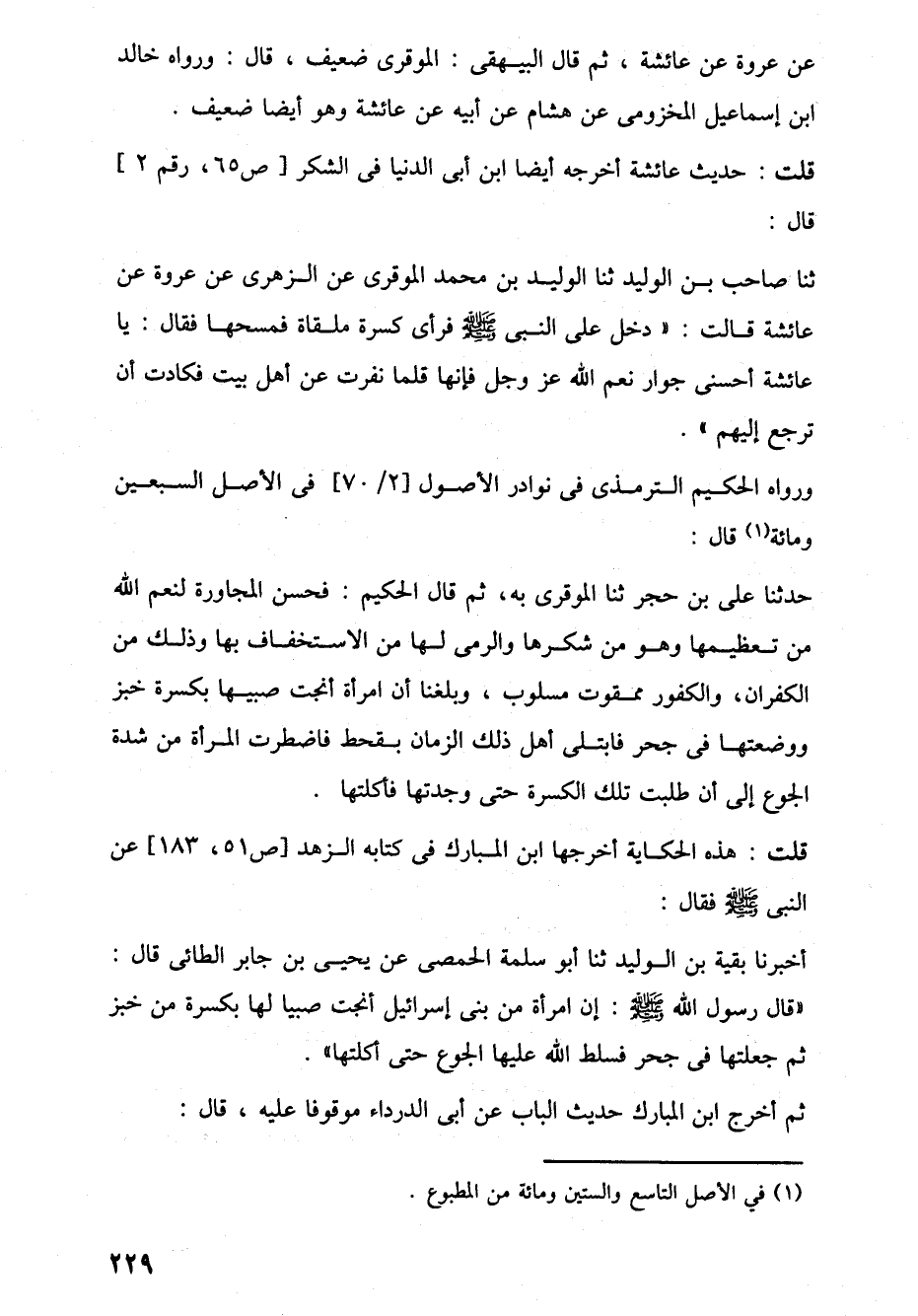 حدثنا على بن حجر ثنا الموقرى به، ثم قال الحكيم: فحسن المجاورة لنعم اللَّه من تعظيمها وهو من شكرها والرمى لها من الاستخفاف بها وذلك من الكفران، والكفور ممقوت مسلوب، وبلغنا أن امرأة أنجت صبيها بكسرة خبز ووضعتها في جحر فابتلى أهل ذلك الزمان بقحط فاضطرت المرأة من شدة الجوع إلى أن طلبت تلك الكسرة حتى وجدتها فأكلتها.