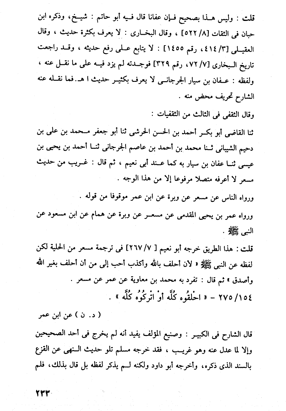 قلت: وليس هذا بصحيح فإن عفانا قال فيه أبو حاتم: شيخ، وذكره ابن حبان في الثقات [8/ 522]، وقال البخارى: لا يعرف بكثرة حديث، وقال العقيلى [3/ 414، رقم 1455]: لا يتابع على رفع حديثه، وقد راجعت تاريخ البخارى [7/ 72، رقم 329] فوجدته لم يزد فيه على ما نقل عنه، ولفظه: عفان بن سيار الجرجانى لا يعرف بكثير حديث اهـ. فما نقله عنه الشارح تحريف محض منه.