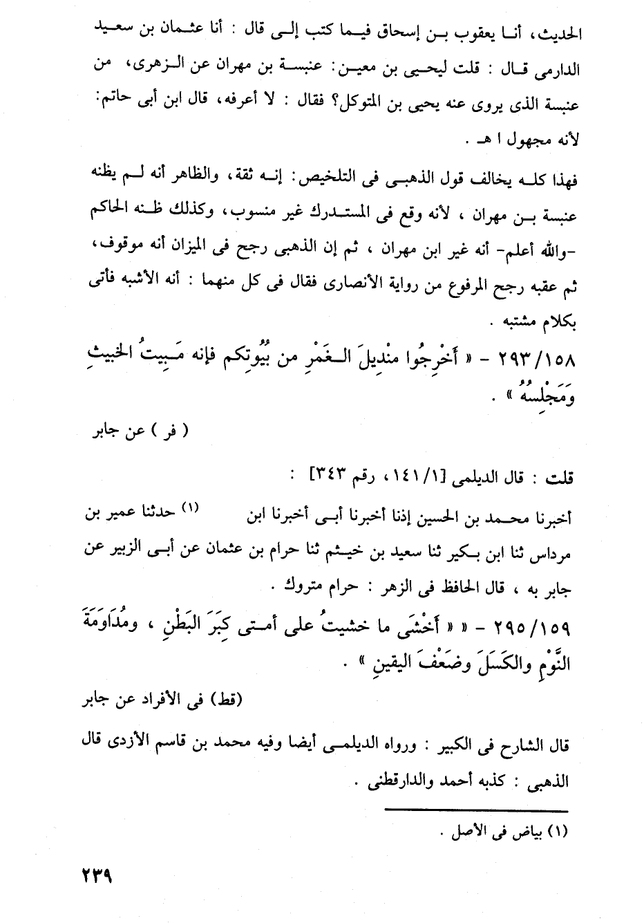 159/ 295 - "أَخْشَى ما خشيتُ على أمتى كِبَرَ البَطْنِ، ومُدَاوَمَةَ النَّوْمِ والكَسَلَ وضَعْفَ اليقينِ". (قط) في الأفراد عن جابر