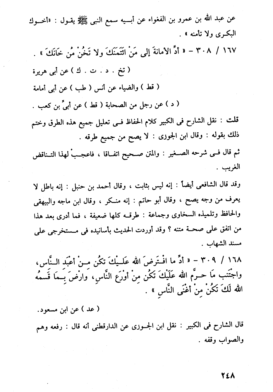 168/ 309 - "أدِّ ما افْتَرضَ اللَّه عَليْكَ تكُن مِنْ أعْبَدِ النَّاس، واجْتَنب مَا حرَّم اللَّه عَلَيْكَ تَكُن مِنْ أَوْرعَ النَّاسِ، وارْضَ بِمَا قَسمُه اللَّه لَكَ تكُنْ مِنْ أغْنَى النَّاسِ". (عد) عن ابن مسعود.
