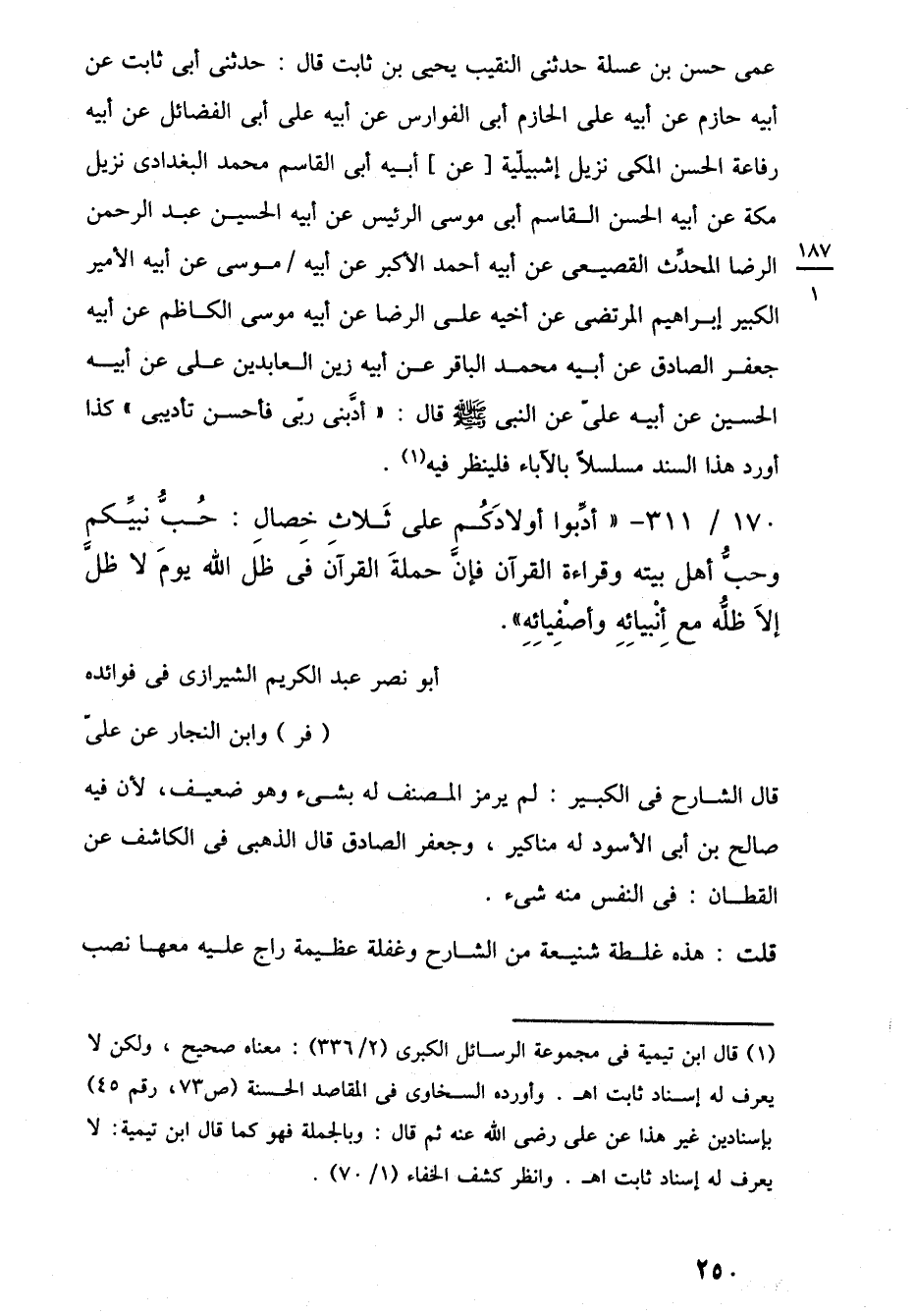 عمى حسن بن عسلة حدثنى النقيب يحيى بن ثابت قال: حدثنى أبي ثابت عن أبيه حازم عن أبيه على الحازم أبي الفوارس عن أبيه على أبي الفضائل عن أبيه رفاعة الحسن المكى نزيل إشبيلّية [عن] أبيه أبي القاسم محمد البغدادى نزيل مكة عن أبيه الحسن القاسم أبي موسى الرئيس عن أبيه الحسين عبد الرحمن الرضا المحدِّث القصيعى عن أبيه أحمد الأكبر عن أبيه موسى عن أبيه الأمير الكبير إبراهيم المرتضى عن أخيه على الرضا عن أبيه موسى الكاظم عن أبيه جعفر الصادق عن أبيه محمد الباقر عن أبيه زين العابدين على عن أبيه الحسين عن أبيه على عن النبي -صلى اللَّه عليه وسلم- قال: "أدَّبنى ربى فأحسن تأديبى" كذا أورد هذا السند مسلسلًا بالآباء فلينظر فيه (¬1).