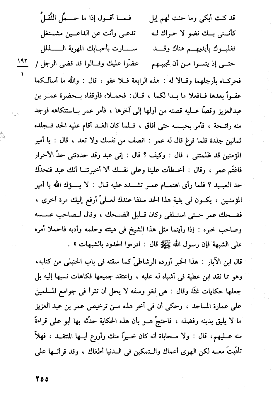 فحركاه بأرجلهما وقالا له: هذه الرابعة فلا عفو، قال: واللَّه ما أسألكما عفوًا بعدها فافعلا ما بدا لكما، قال: فحملاه فأوقفاه بحضرة عمر بن عبد العزيز وقضا عليه قصته من أولها إلى آخرها، فأمر عمر باستنكاهه فوجد منه رائحة، فأمر بحبسه حتى أفاق، فلما كان الغد أقام عليه الحد فجلده ثمانين جلدة فلما فرغ قال له عمر: انصف من نفسك ولا تعد، قال: يا أمير المؤمنين قد ظلمتنى، قال: وكيف؟ قال: إنى عبد وقد حددتنى حدّ الأحرار فاغتم عمر، وقال: أخطأت علينا وعلى نفسك ألا أخبرتنا أنك عبد فنحدّك حد العبيد؟ فلما رأى اهتمام عمر تشدد عليه قال: لا يسؤك اللَّه يا أمير المؤمنين، يكون لى بقية هذا الحد سلفا عندك لعلى أرفع إليك مرة أخرى، فضحك عمر حتى استلقى وكان قليل الضحك، وقال لصاحب عسسه وصاحب خبره: إذا رأيتما مثل هذا الشيخ في هيئته وحلمه وأدبه فاحملا أمره على الشبهة فإن رسول اللَّه -صلى اللَّه عليه وسلم- قال: ادرءوا الحدود بالشبهات".