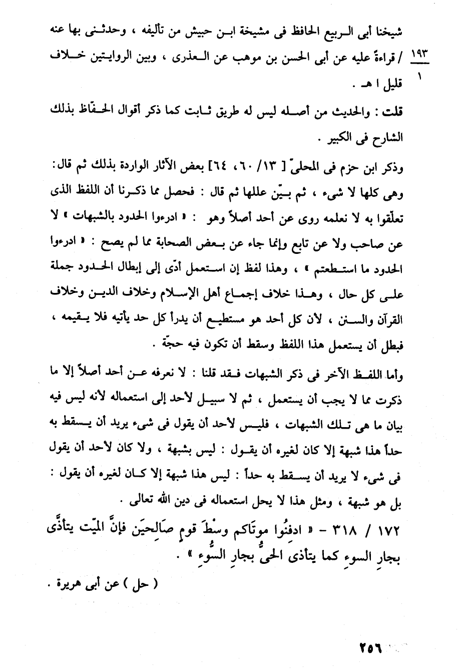 وأما اللفظ الآخر في ذكر الشبهات فقد قلنا: لا نعرفه عن أحد أصلًا إلا ما ذكرت مما لا يجب أن يستعمل، ثم لا سبيل لأحد إلى استعماله لأنه ليس فيه بيان ما هي تلك الشبهات، فليس لأحد أن يقول في شيء يريد أن يسقط به حدًّا هذا شبهة إلا كان لغيره أن يقول: ليس بشبهة، ولا كان لأحد أن يقول في شيء لا يريد أن يسقط به حدًّا: ليس هذا شبهة إلا كان لغيره أن يقول: بل هو شبهة، ومثل هذا لا يحل استعماله في دين اللَّه تعالى.