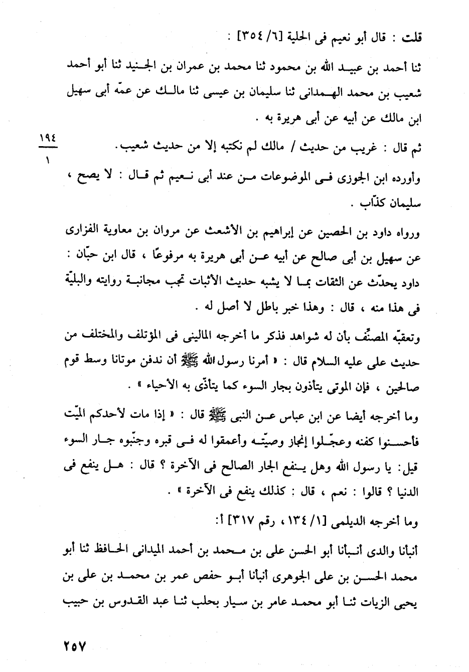 وتعقّبه المصنِّف بأن له شواهد فذكر ما أخرجه المالينى في المؤتلف والمختلف من حديث على عليه السلام قال: "أمرنا رسول اللَّه -صلى اللَّه عليه وسلم- أن ندفن موتانا وسط قوم صالحين، فإن الموتى يتأذون بجار السوء كما يتأذّى به الأحياء".