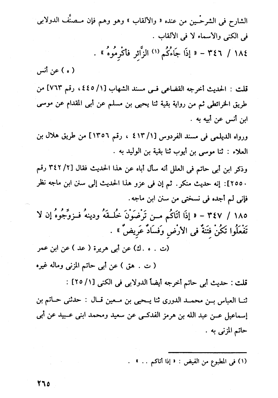185/ 347 - "إِذَا أتَاكُم من تَرْضَوْنَ خُلقَهُ ودينهُ فزوِّجُوهُ إِنْ لا تَفْعَلُوا تَكُنْ فِتَنةٌ في الأرْضِ وَفسَادٌ عَرِيضٌ".