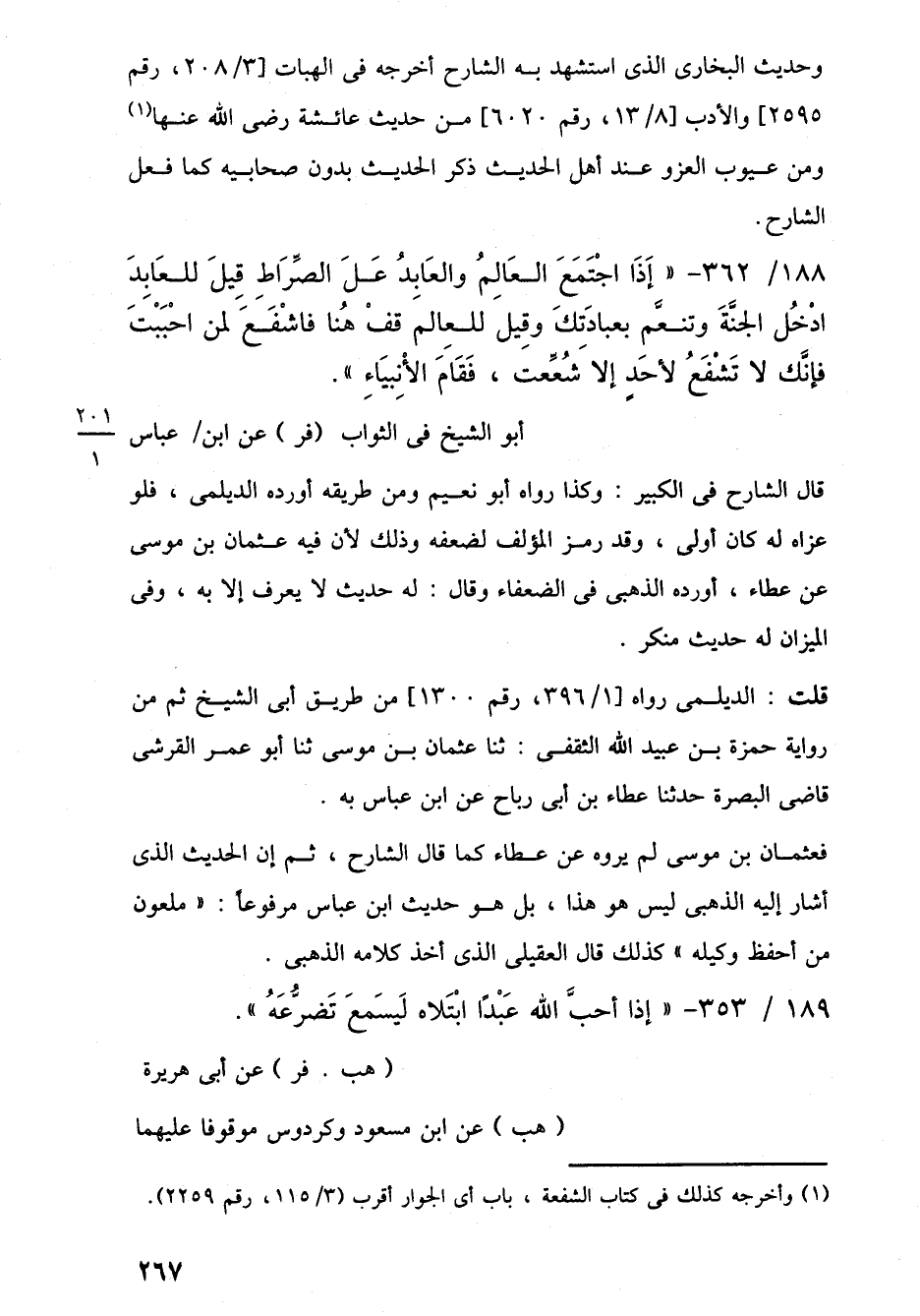 188/ 362 - "إِذَا اجْتَمَعَ العَالِمُ والعَابدُ عَلَ الصِّرَاطِ قِيلَ للعَابِدَ ادْخُل الجنَّةَ وتنعَّم بعبادَتِكَ وقِيل للعالم قفْ هُنا فاشْفَع لمن احْبَبْتَ فإنَّك لا تَشْفَعُ لأحَدٍ إلا شُعِّعت، فَقَامَ الأَنْبِيَاءِ".