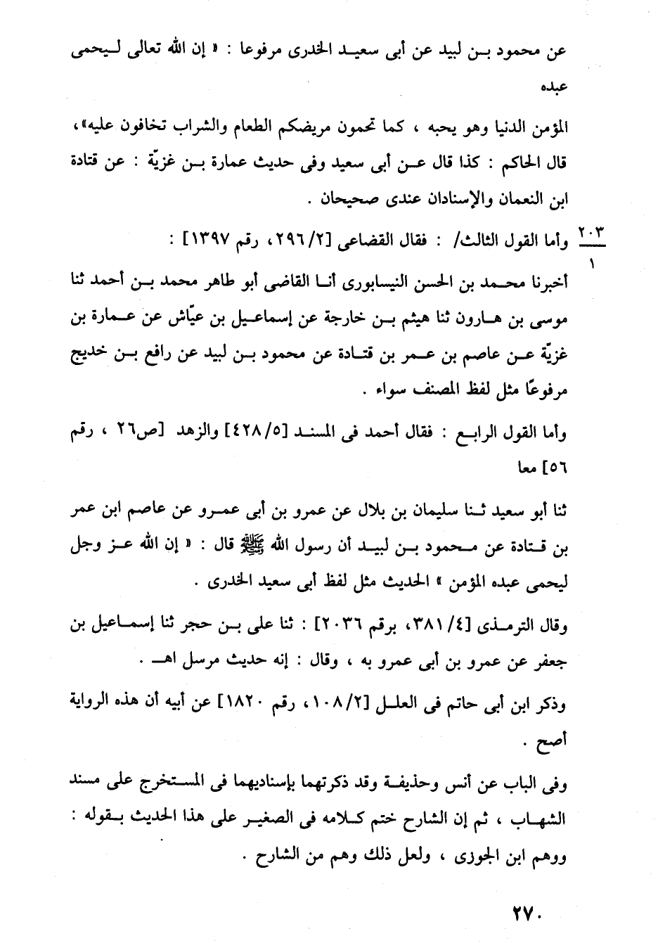 عن محمود بن لبيد عن أبي سعيد الخدرى مرفوعا: "إن اللَّه تعالى ليحمى عبده المؤمن الدنيا وهو يحبه، كما تحمون مريضكم الطعام والشراب تخافون عليه"، قال الحاكم: كذا قال عن أبي سعيد وفي حديث عمارة بن غزيّة: عن قتادة ابن النعمان والإسنادان عندى صحيحان.