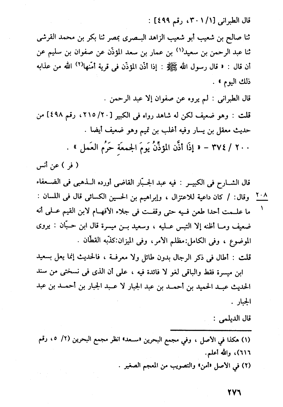 قلت: أطال في ذكر الرجال بدون طائل ولا معرفة، فالحديث إنما يعل بسعيد ابن ميسرة فقط والباقى لغو لا فائدة فيه، على أن الذي في نسختى من سند الحديث عبد الحميد بن أحمد بن عبد الجبار لا عبد الجبار بن أحمد بن عبد الجبار.
