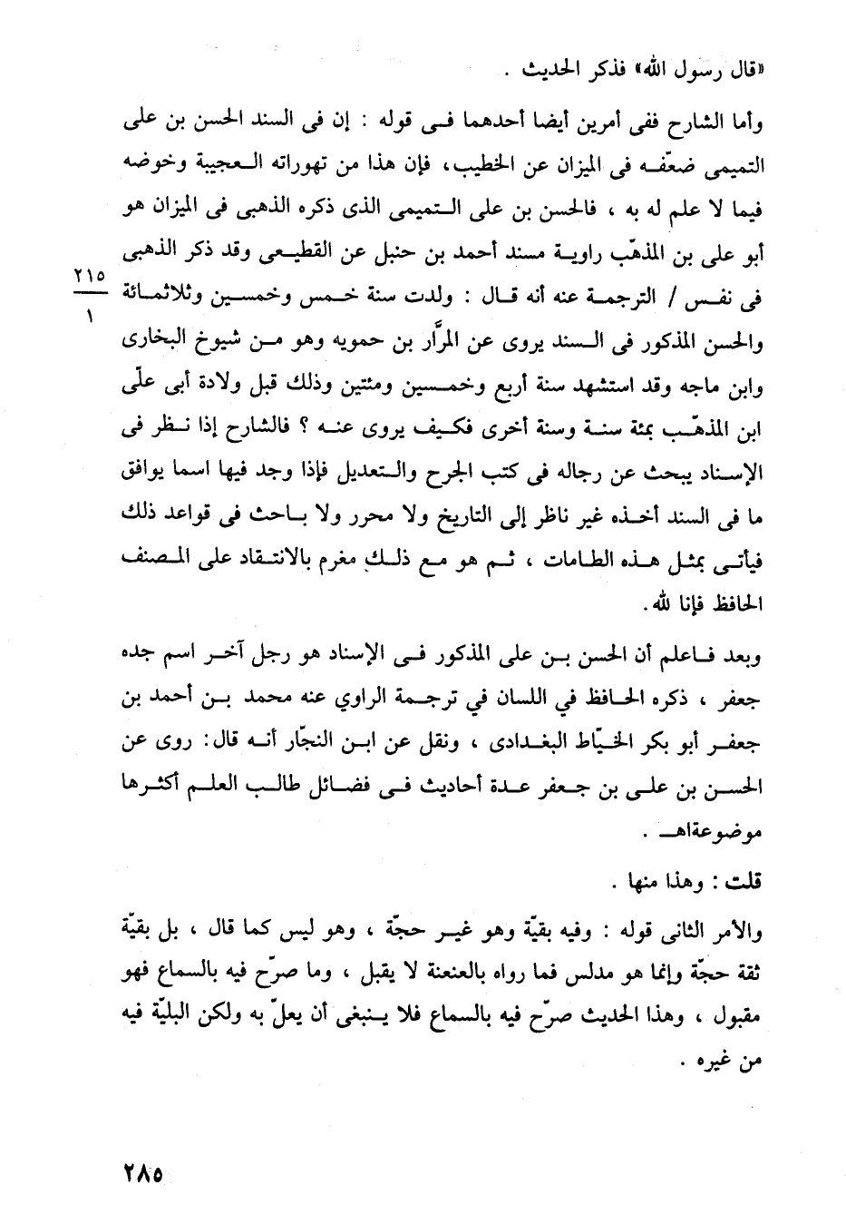 وبعد فاعلم أن الحسن بن على المذكور في الإسناد هو رجل آخر اسم جده جعفر، ذكره الحافظ في اللسان في ترجمة الراوي عنه محمد بن أحمد بن جعفر أبو بكر الخياط البغدادى، ونقل عن ابن النجّار أنه قال: روى عن الحسن بن على بن جعفر عدة أحاديث في فضائل طالب العلم أكثرها موضوعة اهـ.