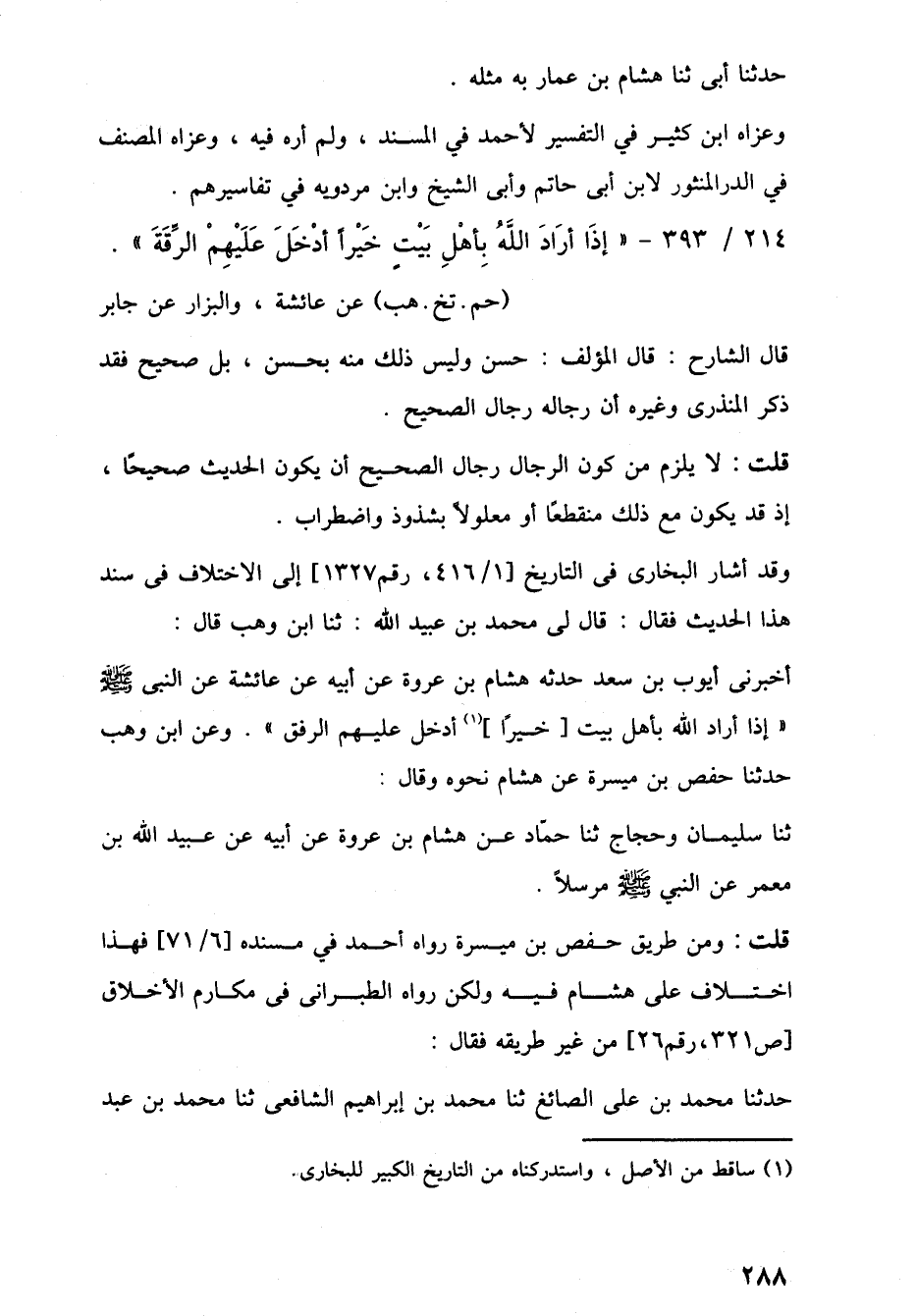 قلت: ومن طريق حفص بن ميسرة رواه أحمد في مسند [6/ 71] فهذا اختلاف على هشام فيه ولكن رواه الطبرانى في مكارم الأخلاق [ص 321، رقم 26] من غير طريقه فقال: