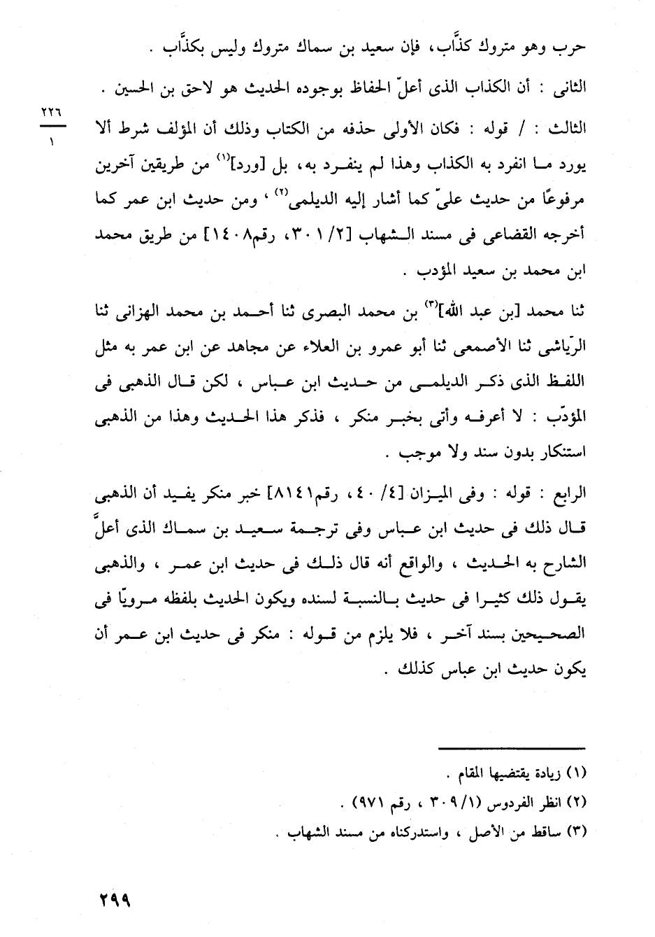 الرابع: قوله: وفي الميزان [4/ 40، رقم 8141] خبر منكر يفيد أن الذهبى قال ذلك في حديث ابن عباس وفي ترجمة سعيد بن سماك الذي أعلَّ الشارح به الحديث، والواقع أنه قال ذلك في حديث ابن عمر، والذهبى يقول ذلك كثيرًا في حديث بالنسبة لسنده ويكون الحديث بلفظه مرويًا في الصحيحين بسند آخر، فلا يلزم من قوله: منكر في حديث ابن عمر أن يكون حديث ابن عباس كذلك.