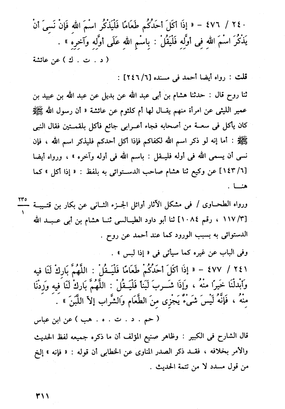 240/ 476 - "إِذَا أكَلَ أحَدُكُم طَعَامًا فَلْيَذْكُر اسْمَ اللَّهِ فإِنْ نَسِى أنْ يَذْكُرَ اسْمَ اللَّهِ في أوَلِهِ فلْيَقُلْ: بِاسْمِ اللَّهِ عَلَى أَوَّلِهِ وآخِرِهِ".