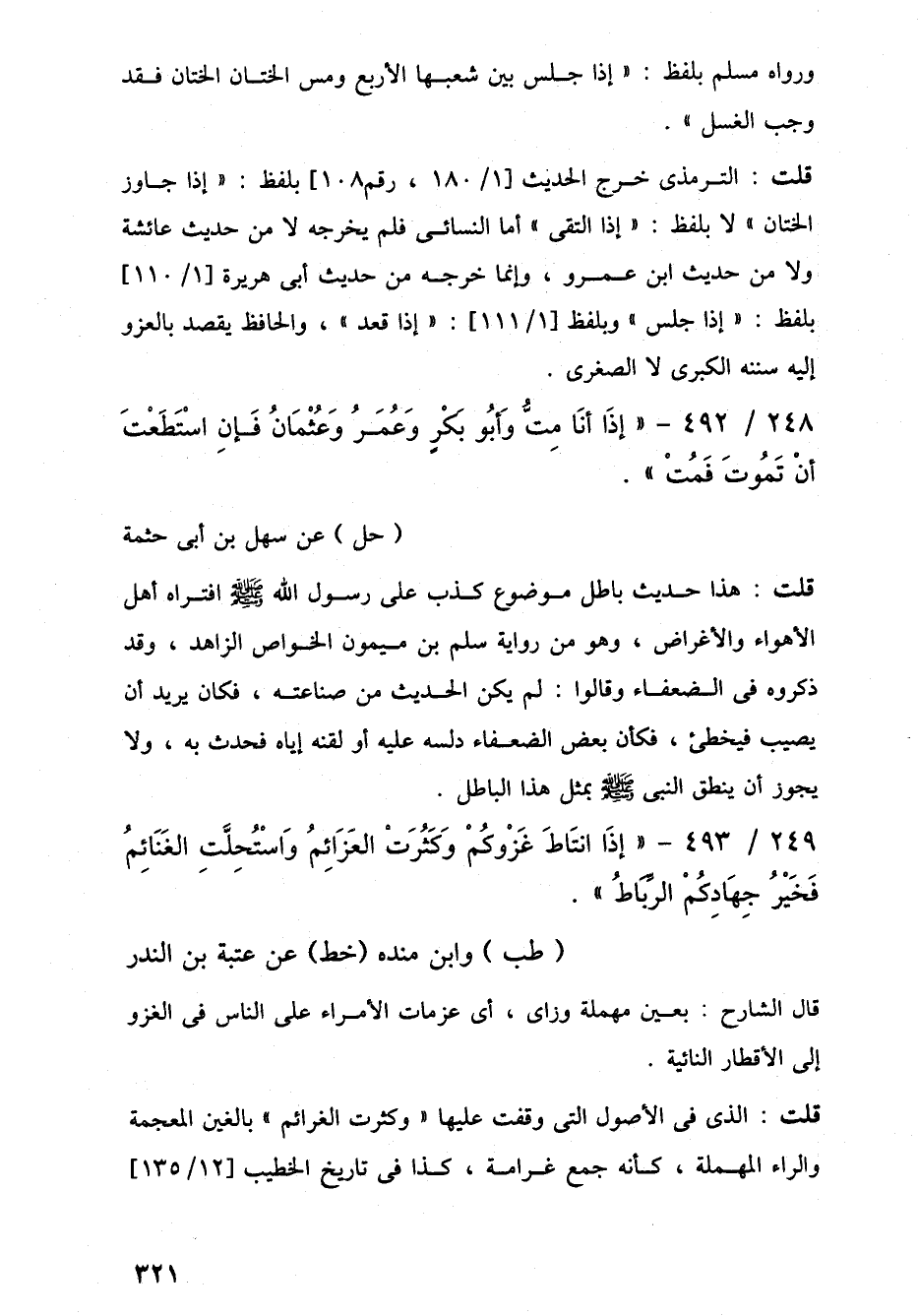 249/ 493 - "إِذَا انتَاطَ غَزْوكُمْ وَكَثُرَتْ العَزَائِمُ وَاسْتُحِلَّتِ الغَنَائِمُ فَخَيْرُ جِهَادِكُمْ الرِّباطُ".