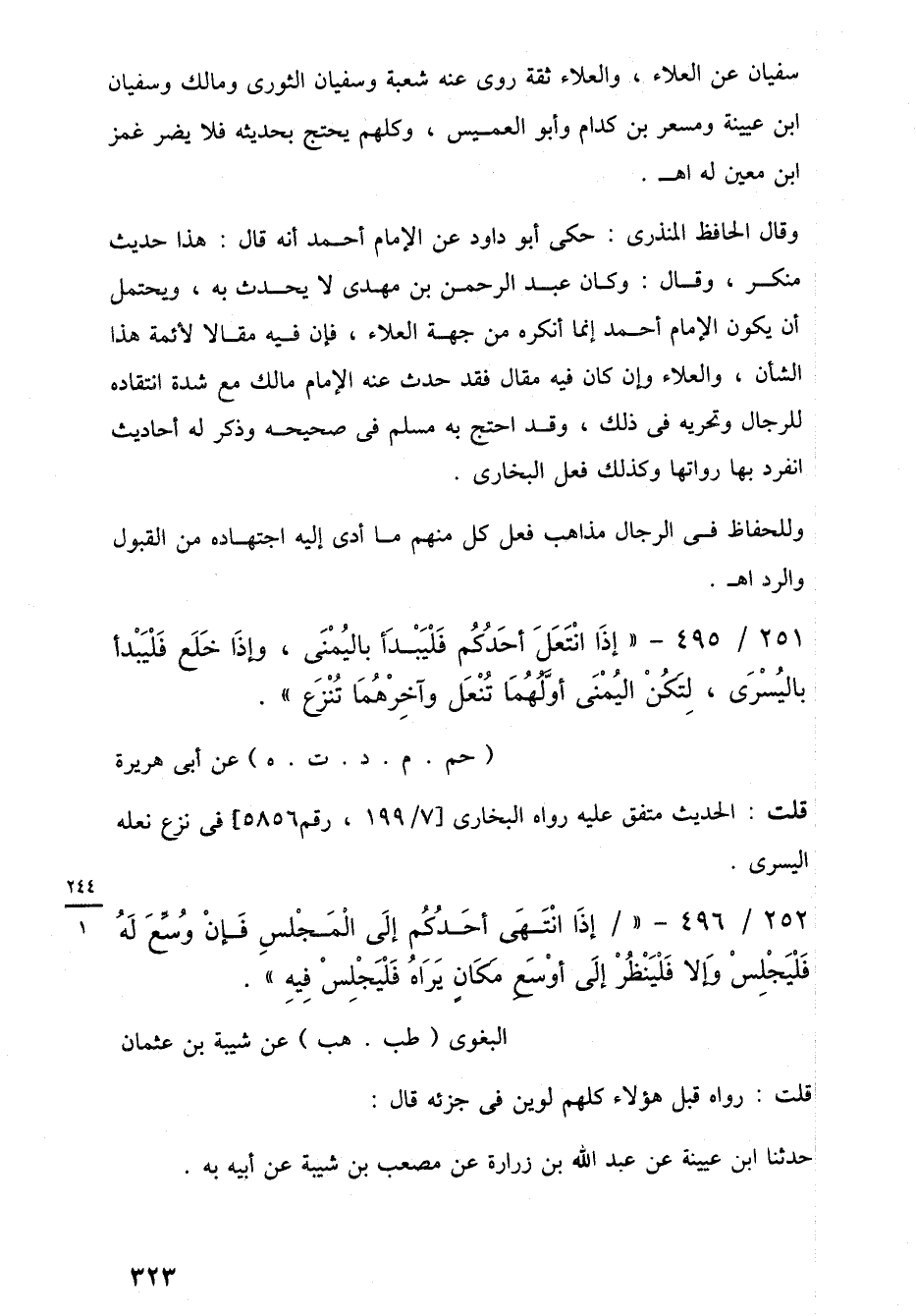 251/ 495 - "إِذَا انْتَعَلَ أَحَدُكُم فَلْيَبدَأ باليُمْنَى، وإذَا خَلَع فلْيَبْدأ باليُسْرَى، لِتكُنْ اليُمْنَى أَوَّلهُمَا تُنْعَل وآخِرْهُمَا تُنْزعَ".