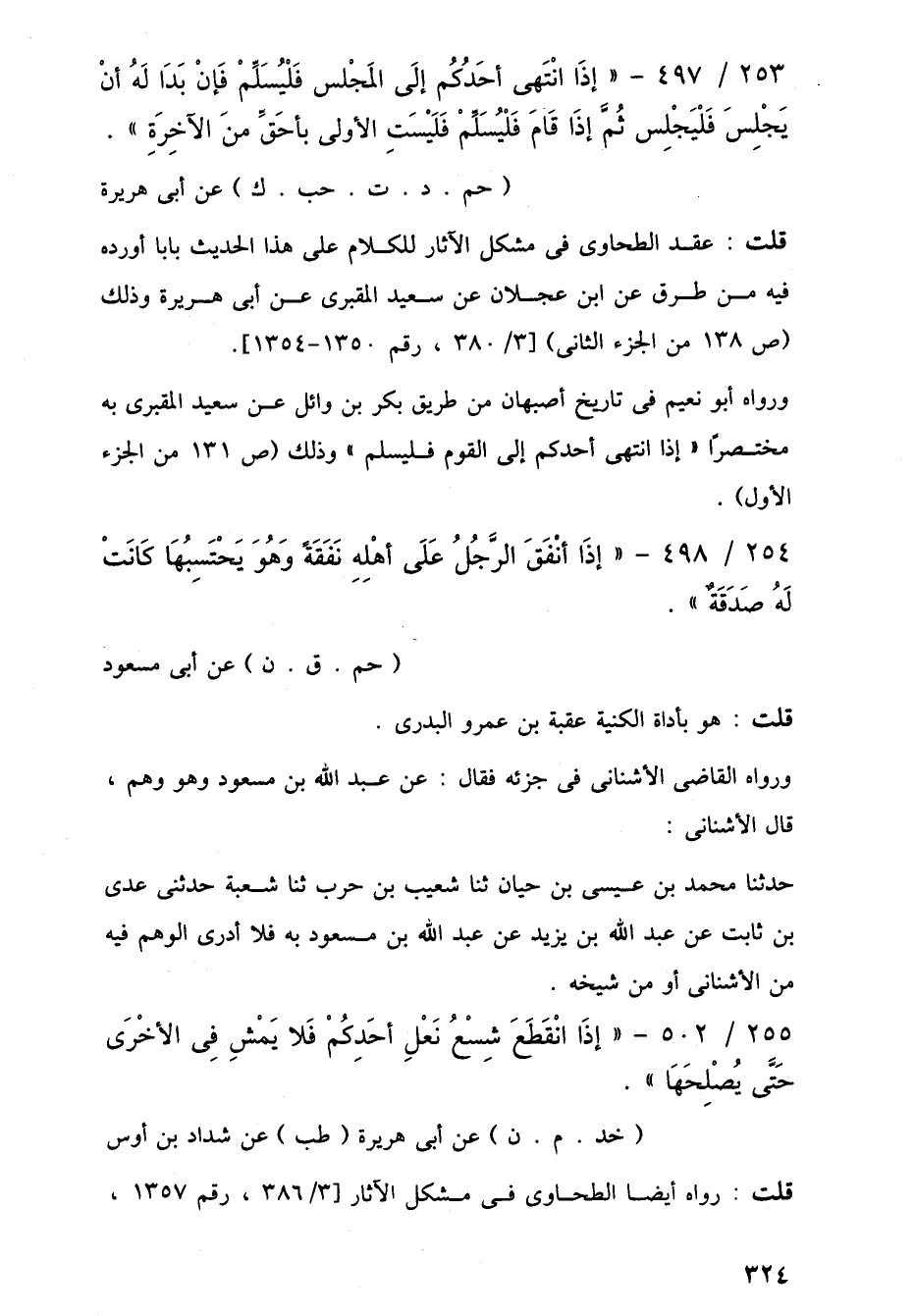 253/ 497 - "إِذَا انْتَهى أحَدُكُم إِلَى المَجْلس فَلْيُسَلِّمْ فَإنْ بَدَا لَهُ أنْ يَجْلِسَ فَلْيَجْلِس ثُمَّ إِذَا قَامَ فَلْيُسَلِّمْ فَلَيْسَتِ الأولى بأحَقِّ منَ الآخِرَةِ".