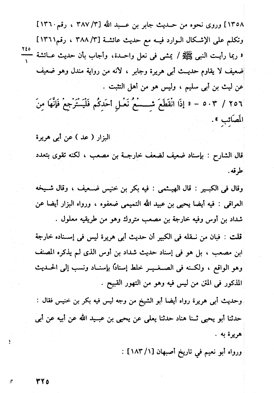 1358] وروى نحوه من حديث جابر بن عبد اللَّه [3/ 387، رقم 1360] وتكلم على الإشكال الوارد فيه مع حديث عائشة [3/ 388، رقم 1361] "ربما رأيت النبي -صلى اللَّه عليه وسلم- يمشى في فعل واحدة، وأجاب بأن حديث عائشة ضعيف لا يقاوم حديث أبي هريرة وجابر؛ لأنه من رواية مندل وهو ضعيف عن ليث بن أبي سليم، وليس هو من أهل التثبت.