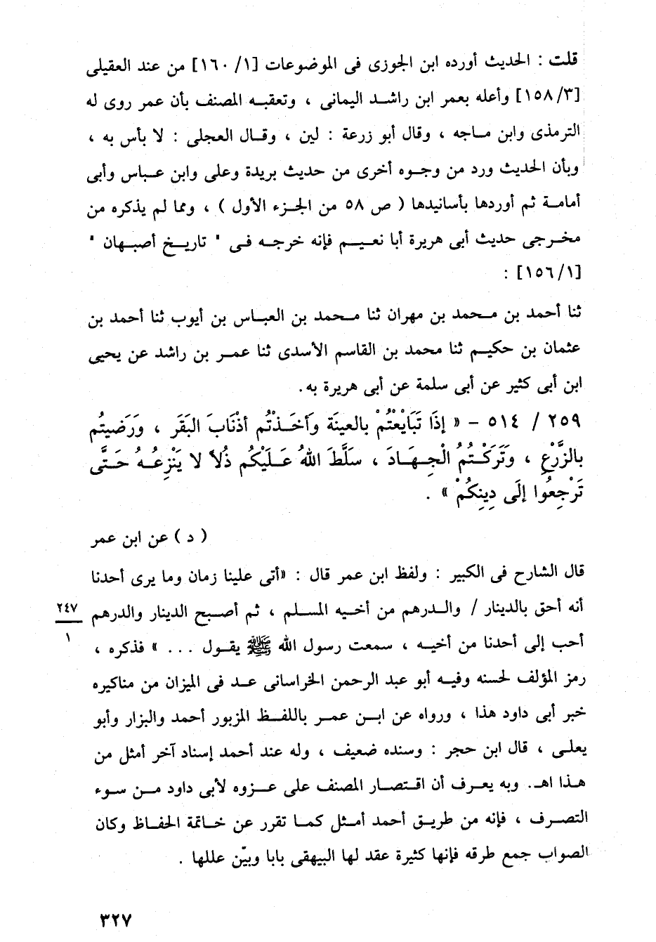 259/ 514 - "إِذَا تَبَايْعْتُمْ بالعينَة وَأَخَذْتُم أَذْنَابَ البَقَر، وَرَضيتُم بالزَّرْعِ، وَتَرَكْتُمُ الْجِهَادَ، سَلَّطَ اللَّهُ عَلَيْكُم ذُلًا يَنْزِعُهُ حَتَّى تَرْجِعُوا إِلَى دِينِكُمْ". (د) عن ابن عمر