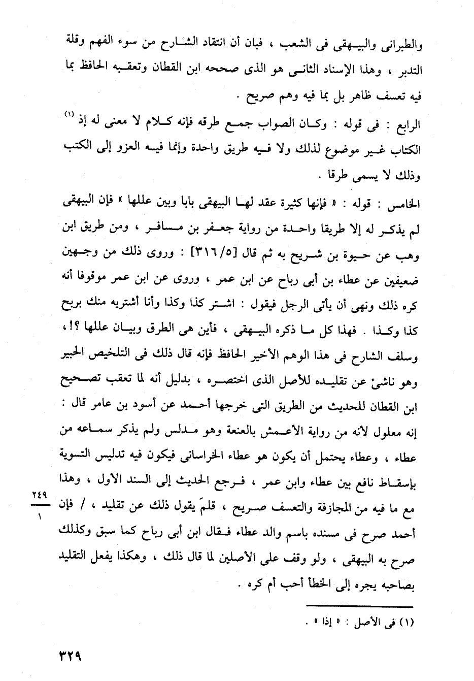 الخامس: قوله: "فإنها كثيرة عقد لها البيهقى بابا وبين عللها" فإن البيهقى لم يذكر له إلا طريقًا واحدة من رواية جعفر بن مسافر، ومن طريق ابن وهب عن حيوة بن شريح به ثم قال [5/ 316]: وروى ذلك من وجهين ضعيفين عن عطاء بن أبي رباح عن ابن عمر، وروى عن ابن عمر موقوفا أنه كره ذلك ونهى أن يأتى الرجل فيقول: اشتر كذا وكذا وأنا أشتريه منك بربح كذا وكذا. فهذا كل ما ذكره البيهقى، فأين هي الطرق وبيان عللها؟!، وسلف الشارح في هذا الوهم الأخير الحافظ فإنه قال ذلك في التلخيص الحبير وهو ناشئ عن تقليده للأصل الذي اختصره، بدليل أنه لما تعقب تصحيح ابن القطان للحديث من الطريق التي خرجها أحمد عن أسود بن عامر قال: إنه معلول لأنه من رواية الأعمش بالعنعة وهو مدلس ولم يذكر سماعه من عطاء، وعطاء يحتمل أن يكون هو عطاء الخراسانى فيكون فيه تدليس التسوية بإسقاط نافع بين عطاء وابن عمر، فرجع الحديث إلى السند الأول، وهذا مع ما فيه من المجازفة والتعسف صريح، قلمَ يقول ذلك عن تقليد، فإن أحمد صرح في مسنده باسم والد عطاء فقال ابن أبي رباح كما سبق وكذلك صرح به البيهقى، ولو وقف على الأصلين لما قال ذلك، وهكذا يفعل التقليد بصاحبه يجره إلى الخطأ أحب أم كره.