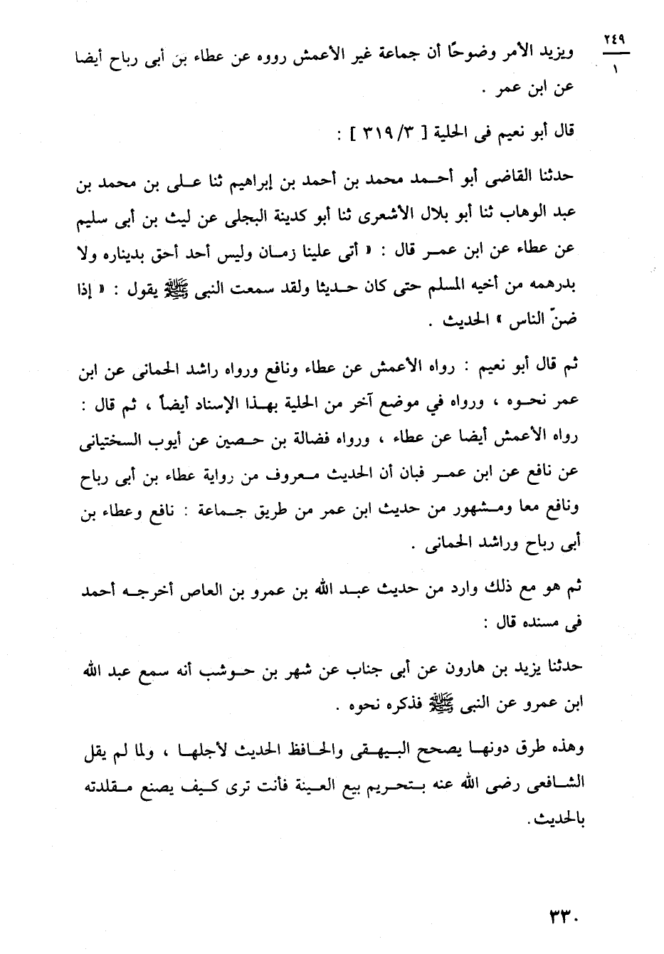 وهذه طرق دونها يصحح البيهقى والحافظ الحديث لأجلها، ولما لم يقل الشافعي رضى اللَّه عنه بتحريم بيع العينة فأنت ترى كيف يصنع مقلدته بالحديث.