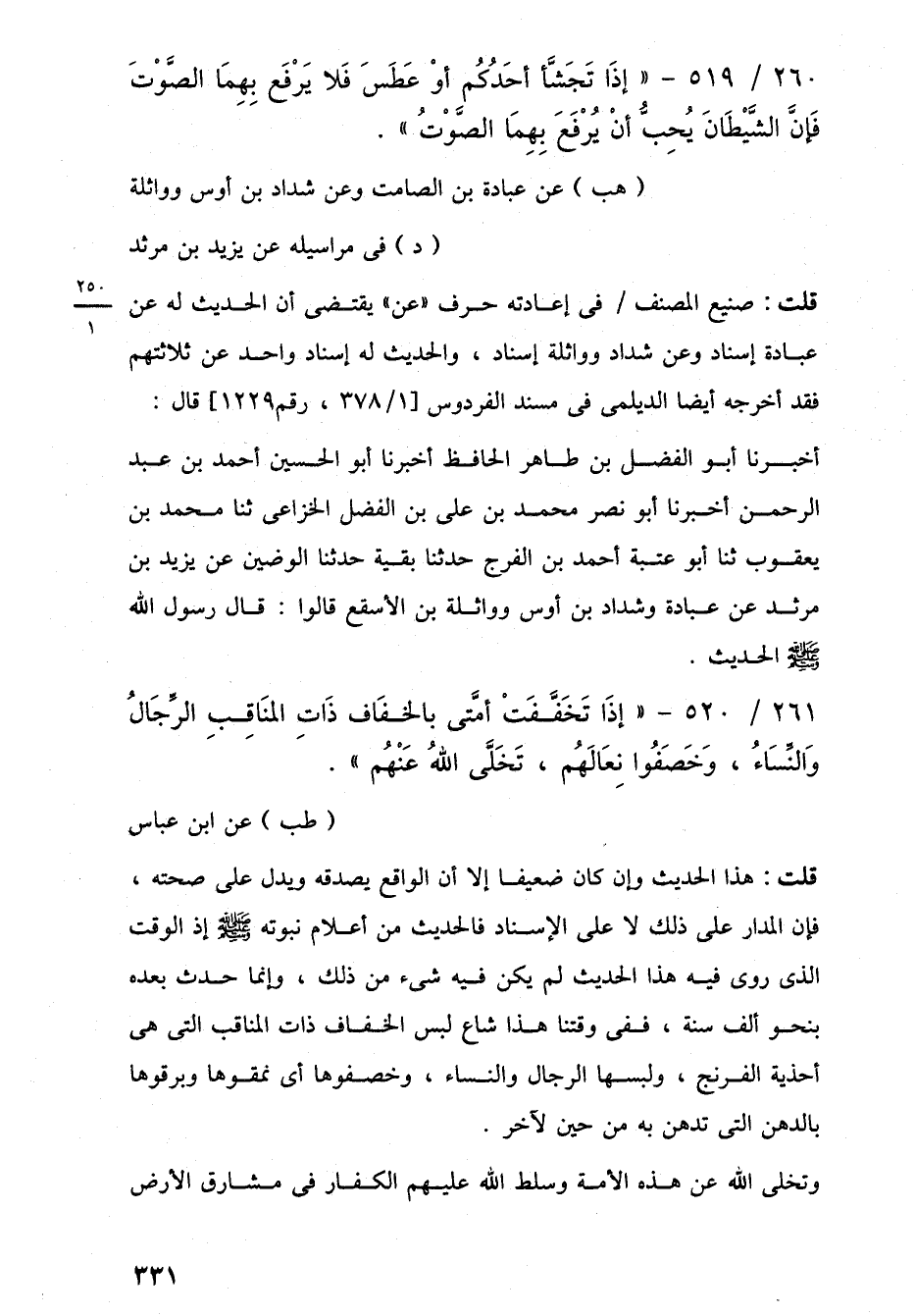 260/ 519 - "إِذَا تَجَشَّأ أحَدُكُم أوْ عَطَسَ فَلا يَرْفَع بِهِمَا الصَّوْتَ فَإِنَّ الشَّيْطَانَ يُحِبُّ أنْ يُرْفَعَ بِهِمَا الصَّوْتُ".