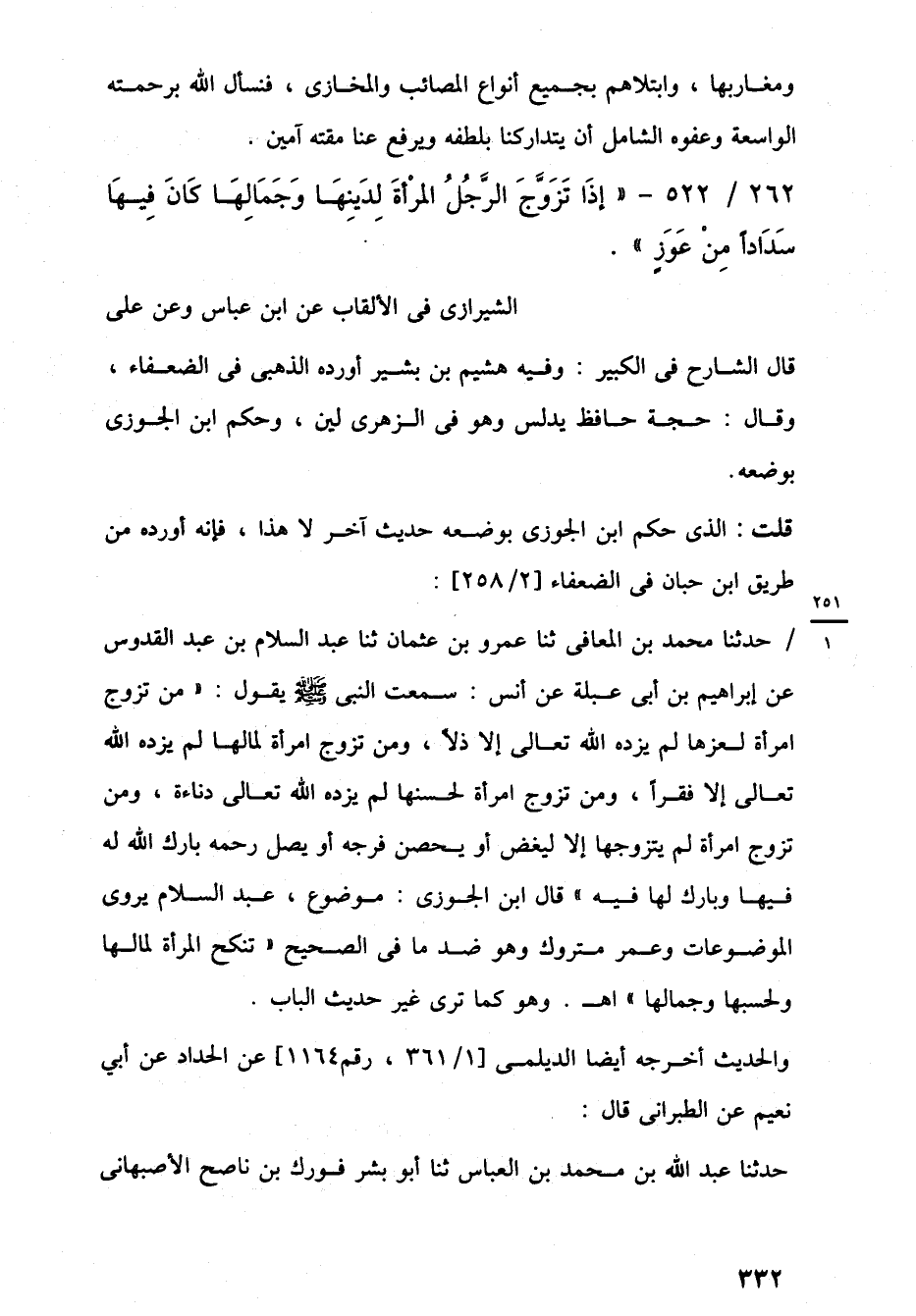 262/ 522 - "إِذَا تَزَوَّجَ الرَّجُلُ المرْأةَ لِدَينِهَا وَجَمَالِهَا كَانَ فِيهَا سَدَادًا مِنْ عَوَزٍ".