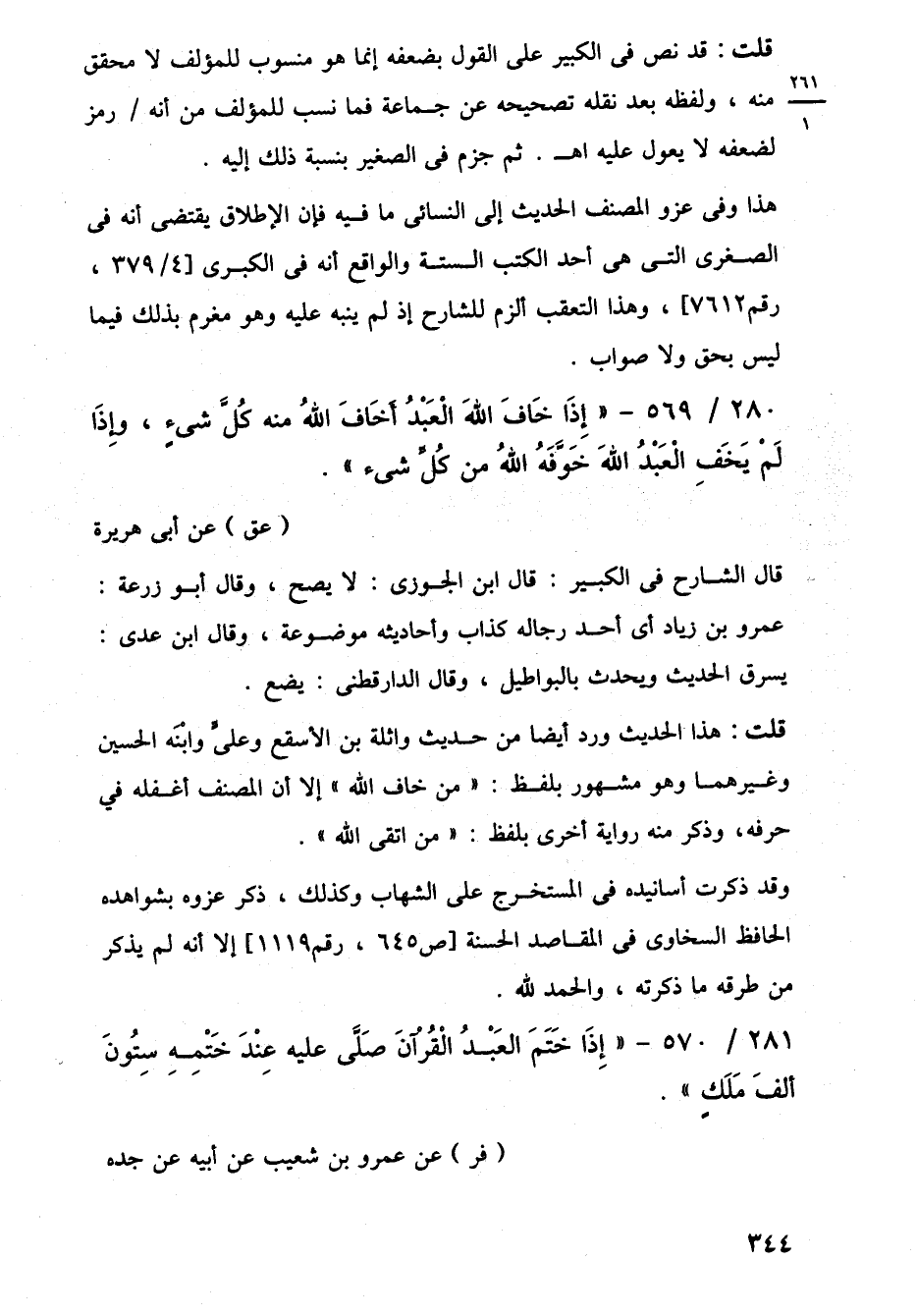 280/ 569 - "إِذَا خَافَ اللَّهَ الْعَبْدُ أخَافَ اللَّهُ منه كُلَّ شئٍ، وإِذَا لَمْ يَخَفِ الْعَبْدُ اللَّهَ خَوَّفَهُ اللَّهُ من كُلِّ شيء". (عق) عن أبي هريرة