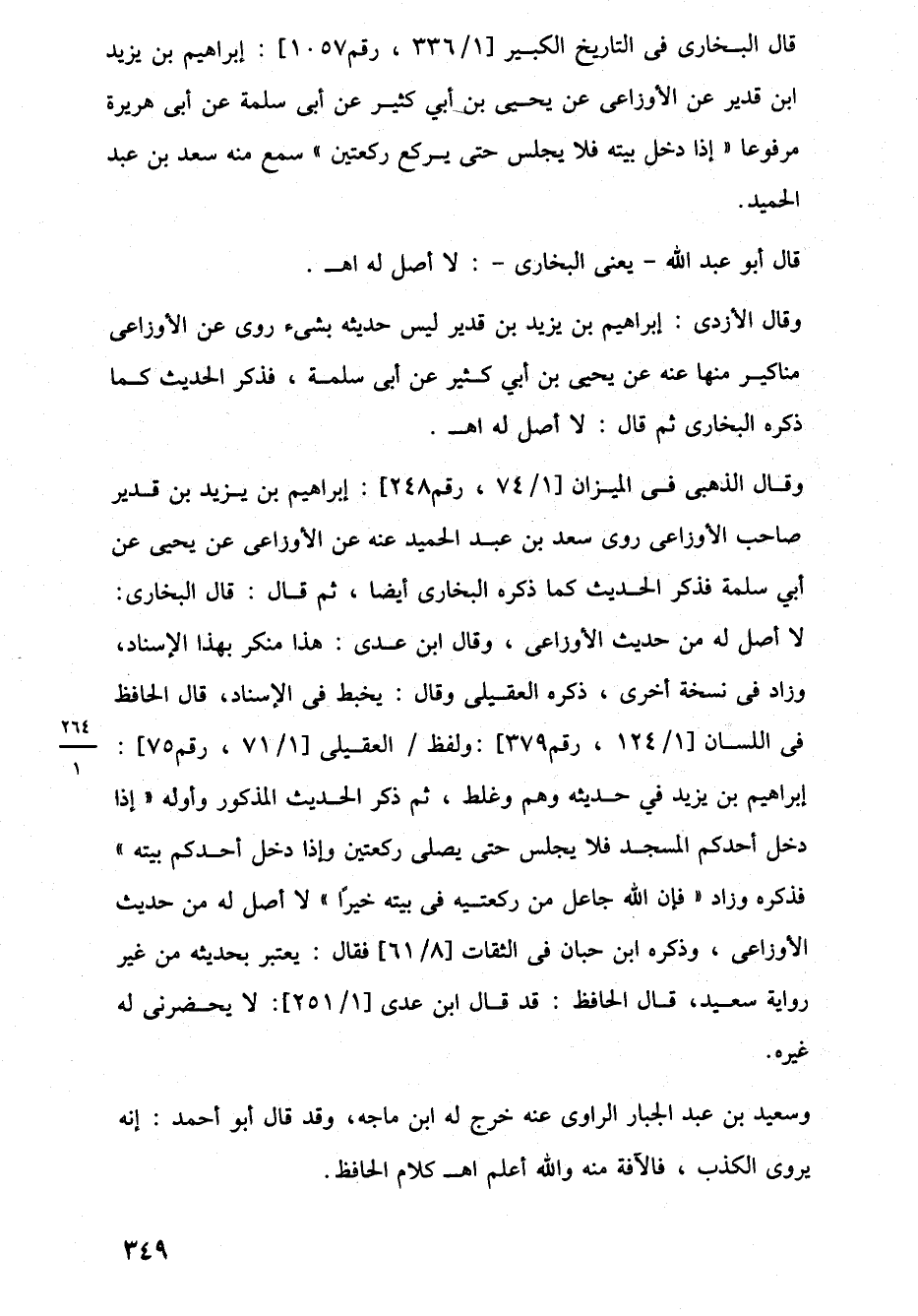 وقال الذهبى في الميزان [1/ 74، رقم 248]: إبراهيم بن يزيد بن قدير صاحب الأوزاعى روى سعد بن عبد الحميد عنه عن الأوزاعى عن يحيى عن أبي سلمة فذكر الحديث كما ذكره البخارى أيضا، ثم قال: قال البخارى: لا أصل له من حديث الأوزاعى، وقال ابن عدى: هذا منكر بهذا الإسناد، وزاد في نسخة أخرى، ذكره العقيلى وقال: يخبط في الإسناد، قال الحافظ في اللسان [1/ 124، رقم 379]: ولفظ العقيلى [1/ 71، رقم 75]: إبراهيم بن يزيد في حديثه وهم وغلط، ثم ذكر الحديث المذكور وأوله "إذا دخل أحدكم المسجد فلا يجلس حتى يصلى ركعتين وإذا دخل أحدكم بيته" فذكره وزاد" فإن اللَّه جاعل من ركعتيه في بيته خيرًا" لا أصل له من حديث الأوزاعى، وذكره ابن حبان في الثقات [8/ 61] فقال: يعتبر بحديثه من غير رواية سعيد، قال الحافظ: قد قال ابن عدى [1/ 251]: لا يحضرنى له غيره.