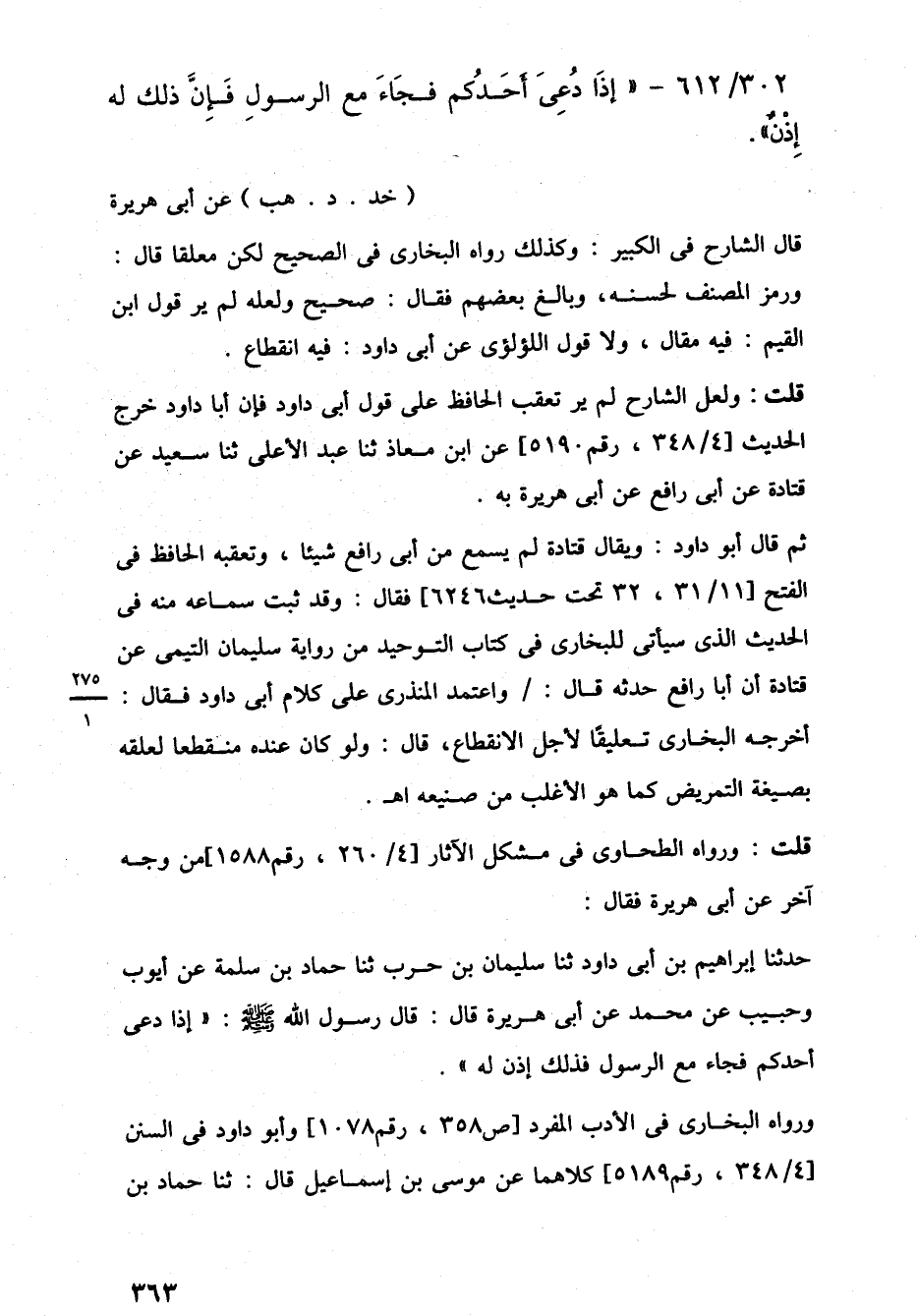 302/ 612 - "إِذَا دُعِى أَحَدُكم فجَاءَ مع الرسولِ فَإِنَّ ذلك له إِذْنٌ". (خد. د. هب) عن أبي هريرة