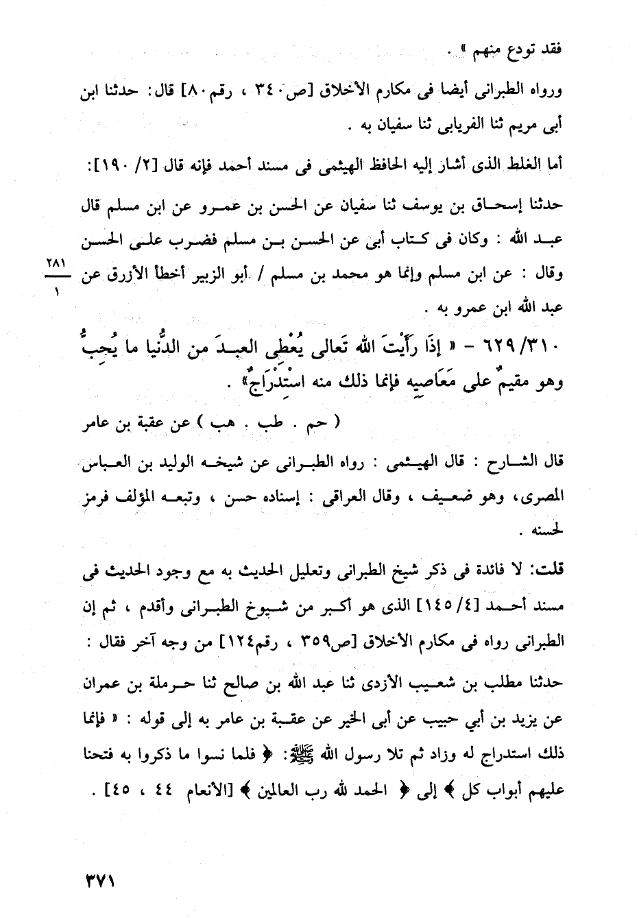حدثنا مطلب بن شعيب الأزدى ثنا عبد اللَّه بن صالح ثنا حرملة بن عمران عن يزيد بن أبي حبيب عن أبي الخير عن عقبة بن عامر به إلى قوله: "فإنما ذلك استدراج له وزاد ثم تلا رسول اللَّه -صلى اللَّه عليه وسلم-: {فَلَمَّا نَسُوا مَا ذُكِّرُوا بِهِ فَتَحْنَا عَلَيْهِمْ أَبْوَابَ كُلِّ} إلى {وَالْحَمْدُ لِلَّهِ رَبِّ الْعَالَمِينَ} [الأنعام: 44، 45]
