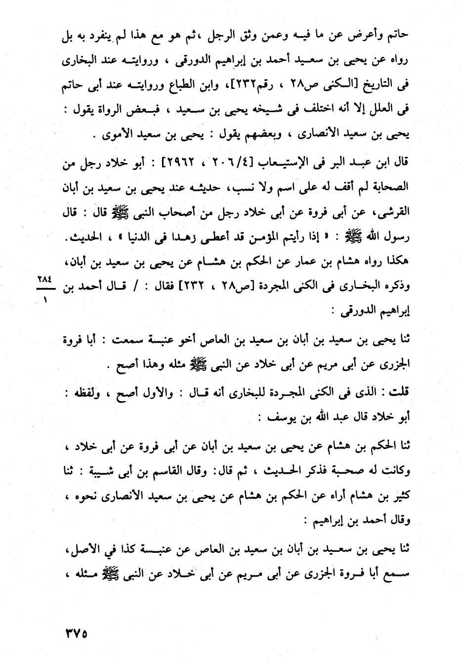 ثنا الحكم بن هشام عن يحيى بن سعيد بن أبان عن أبي فروة عن أبي خلاد، وكانت له صحبة فذكر الحديث، ثم قال: وقال القاسم بن أبي شيبة: ثنا كثير بن هشام أراه عن الحكم بن هشام عن يحيى بن سعيد الأنصارى نحوه، وقال أحمد بن إبراهيم: