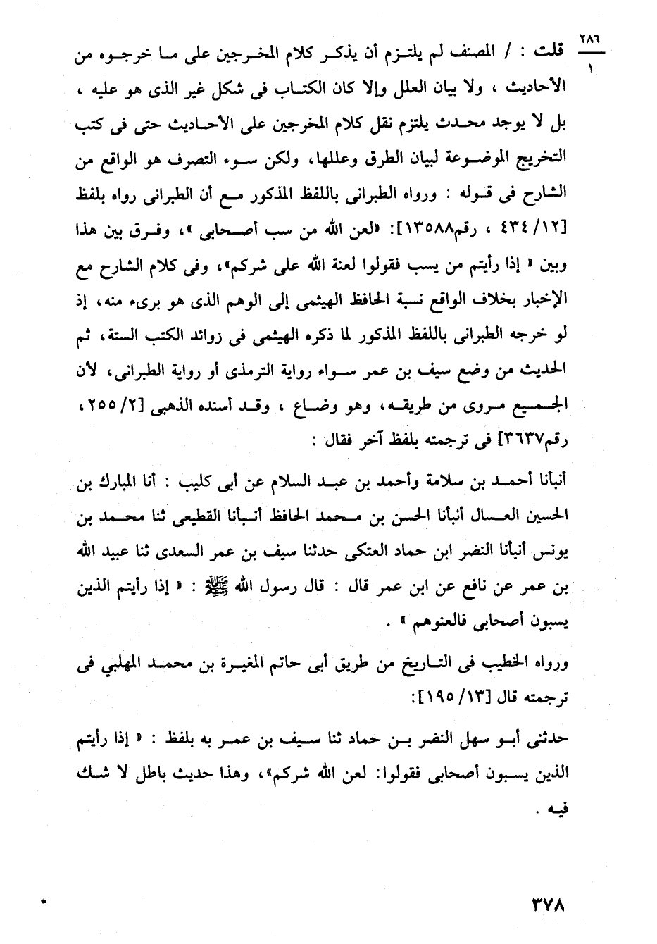 أنبأنا أحمد بن سلامة وأحمد بن عبد السلام عن أبي كليب: أنا المبارك بن الحسين العسال أنبأنا الحسن بن محمد الحافظ أنبأنا القطيعى ثنا محمد بن يونس أنبأنا النضر ابن حماد العتكى حدثنا سيف بن عمر السعدى ثنا عبيد اللَّه بن عمر عن نافع عن ابن عمر قال: قال رسول اللَّه -صلى اللَّه عليه وسلم-: "إذا رأيتم الذين يسبون أصحابى فالعنوهم".