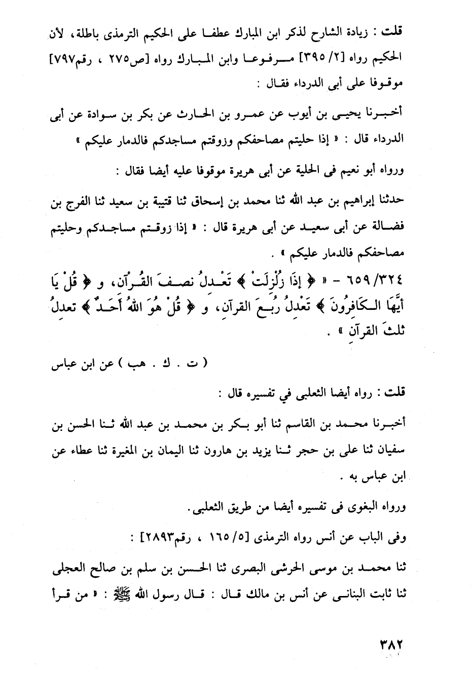 324/ 659 - " {إِذَا زُلْزِلَتِ} تَعْدِلُ نصفَ القُرْآن، و {قُلْ يَاأَيُّهَا الْكَافِرُونَ} تَعْدِلُ رُبعَ القرآنِ، و {قُلْ هُوَ اللَّهُ أَحَدٌ} تعدِلُ ثلثَ القرآنِ". (ت. ك. هب) عن ابن عباس