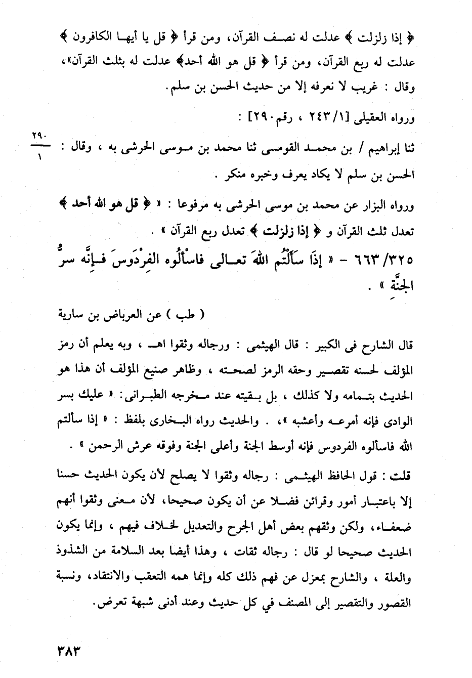 ورواه البزر عن محمد بن موسى الحرشى به مرفوعا: " {قُلْ هُوَ اللَّهُ أَحَدٌ} تعدل ثلث القرآن و {إِذَا زُلْزِلَتِ} تعدل ربع القرآن".